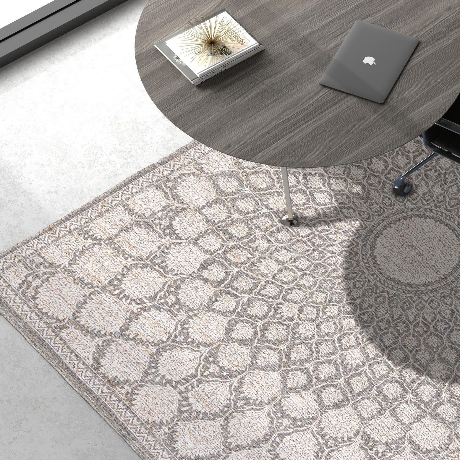 A 2x3 rectangular Rugs.com Chenille Jute rug featuring a modern medallion pattern in ivories, creams, and grays.