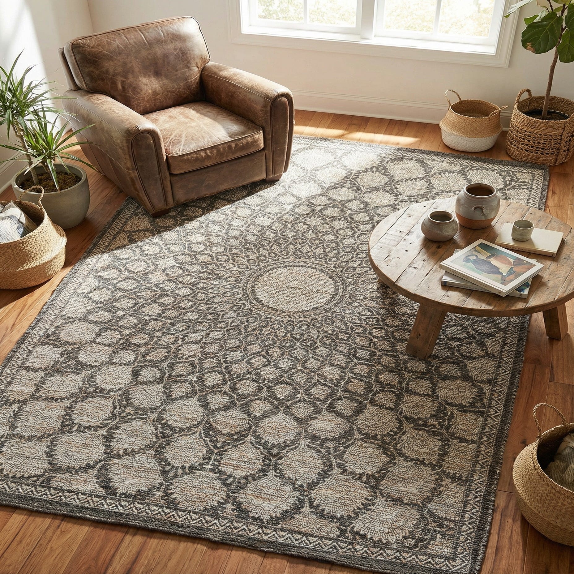 Underfoot the rug pairs soft chenille loops with the natural texture of jute, offering a tactile contrast that’s both comfortable and texturally interesting. It works well in a relaxed living room layered over hardwood, beneath a natural wood dining table to soften the space, or in a home office where neutral tones and pattern add quiet interest. The charcoal and ivory palette fits modern farmhouse, transitional, and muted contemporary interiors, and it coordinates easily with metal, leather, and warm wood finishes.