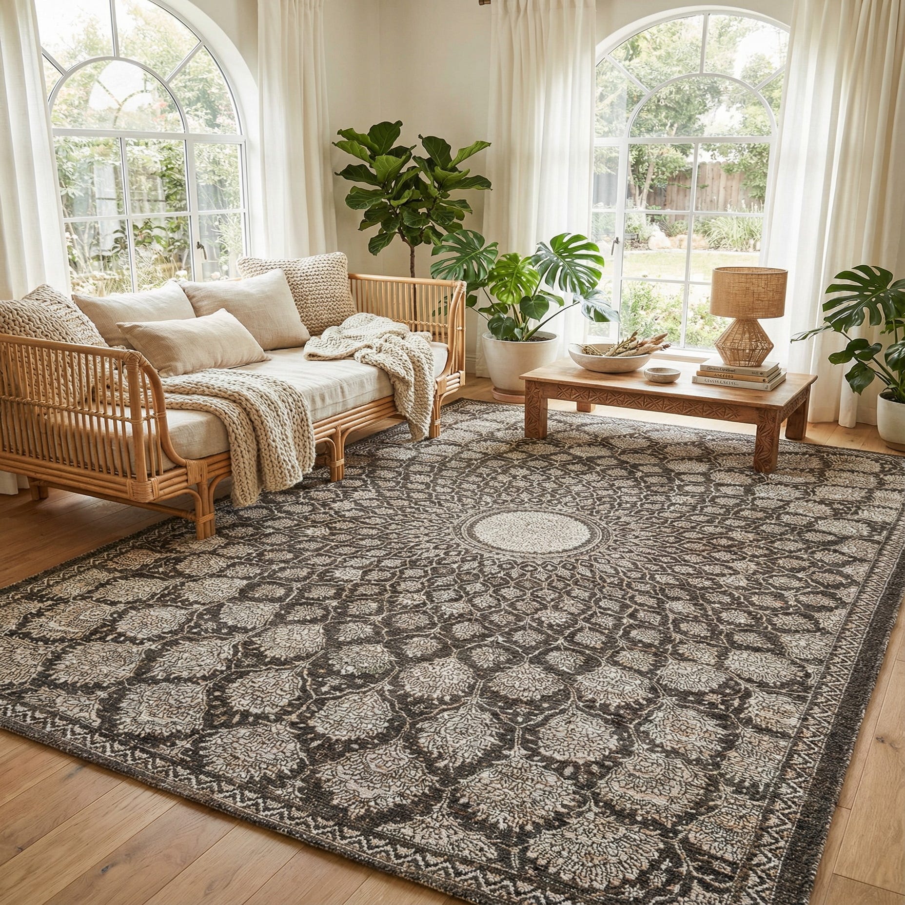 A detailed central medallion unfurls across this rug in a layered floral-and-petal pattern, framed by a narrow patterned border. The design alternates between charcoal and ivory, creating a strong but neutral contrast that highlights the fine, repeating motifs. Hand made of chenille and jute, the surface combines the plush, velvety feel of chenille with the natural, slightly coarse texture of jute for a tactile, dimensional look underfoot.