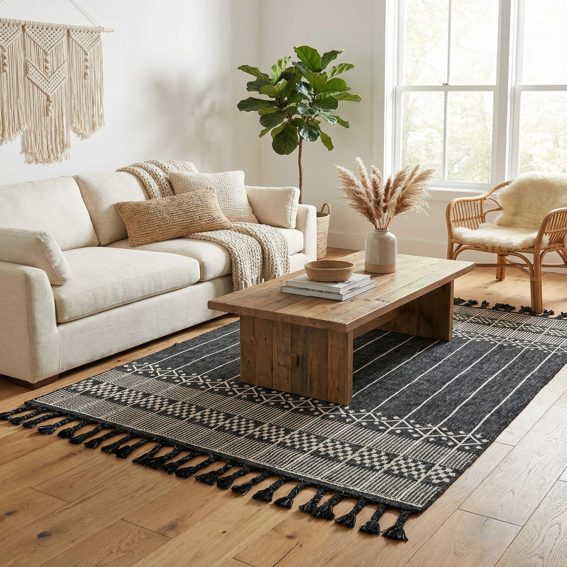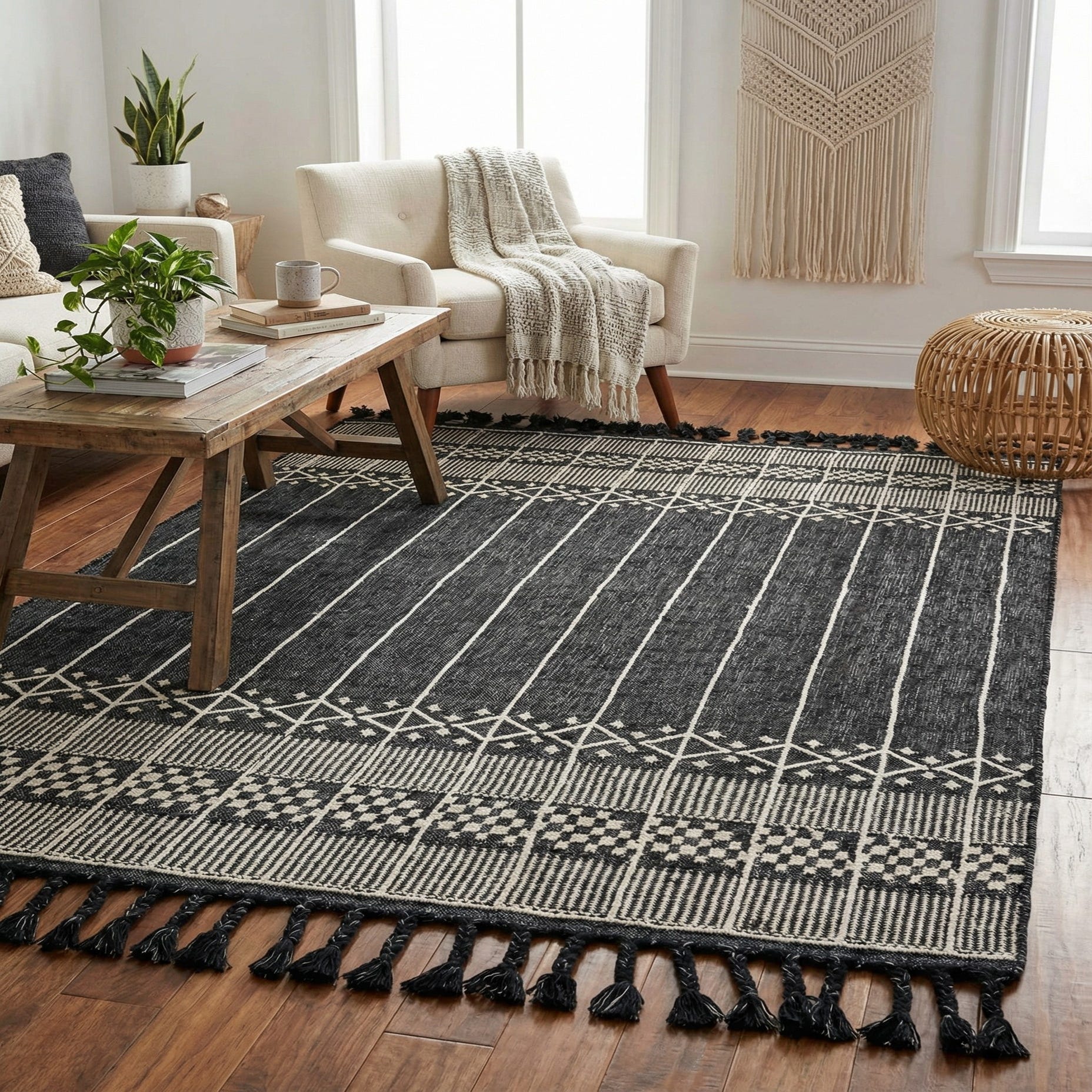 A 4x6 rectangular black and white bohemian rug with vertical stripes and geometric patterns, featuring braided tassels.