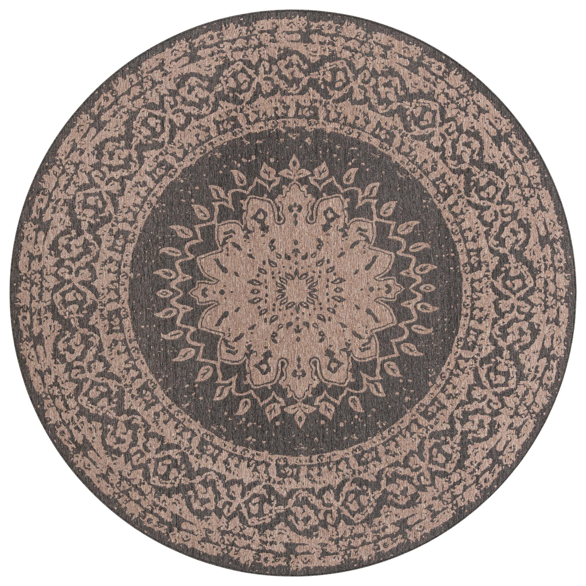 Woven in 100% polypropylene for long-lasting performance, this rug suits covered patios, sunrooms, or high-traffic indoor living and dining areas. Place it beneath a round dining table, anchor a seating group on a covered terrace, or layer it over a larger neutral rug to define a conversation nook. Its charcoal and natural palette pairs easily with warm wood furniture, black metal accents, linen upholstery, and traditional or modern-transitional decor.