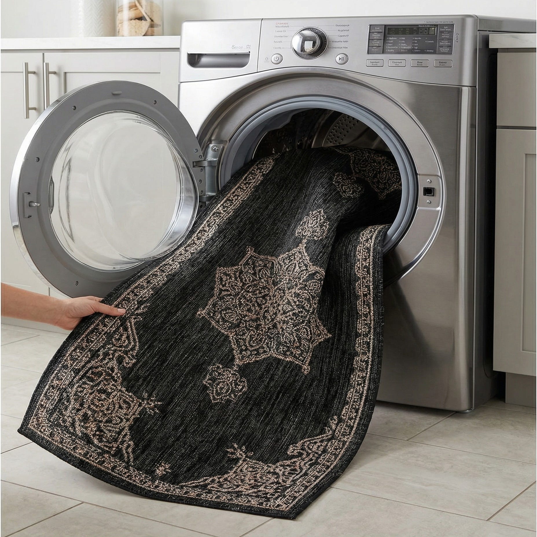 A 10 ft black and gray runner rug with a traditional medallion pattern and a flat, textured pile, suitable for a hallway or patio.
