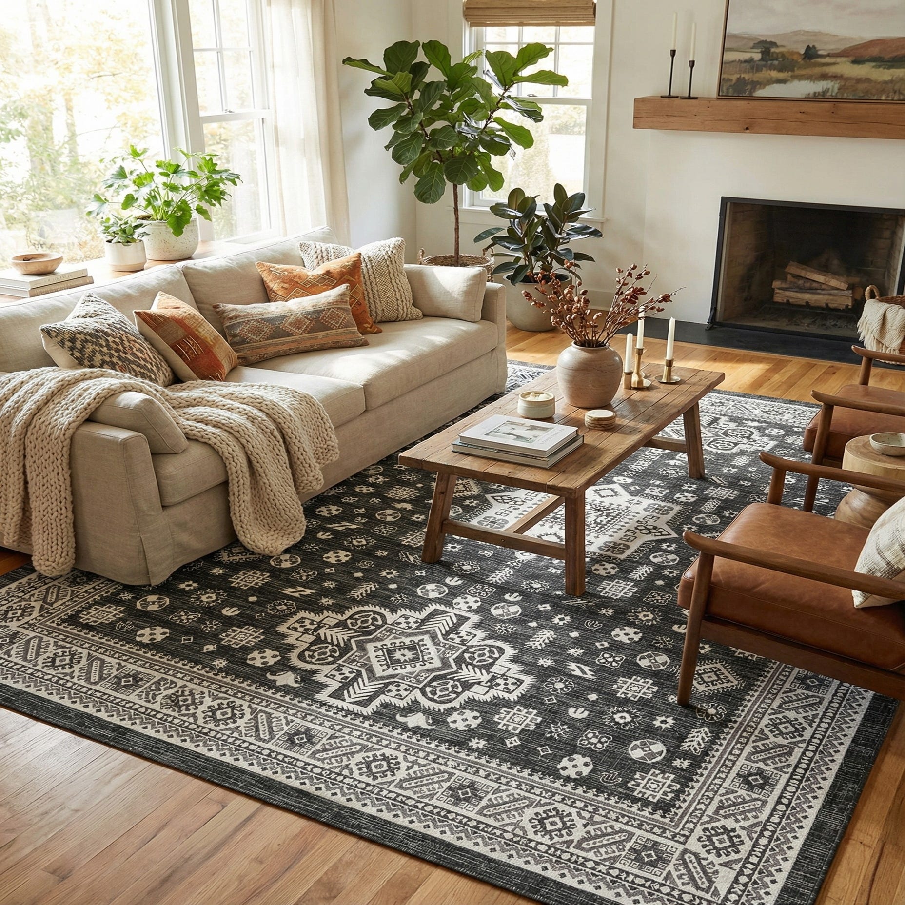 The rug displays a dynamic Aztec-inspired pattern, featuring a harmonious blend of charcoal gray and ivory hues that command attention while seamlessly integrating into various color palettes. The charcoal gray background anchors the design, providing a deep contrast to the intricate ivory motifs that offer an engaging visual texture.