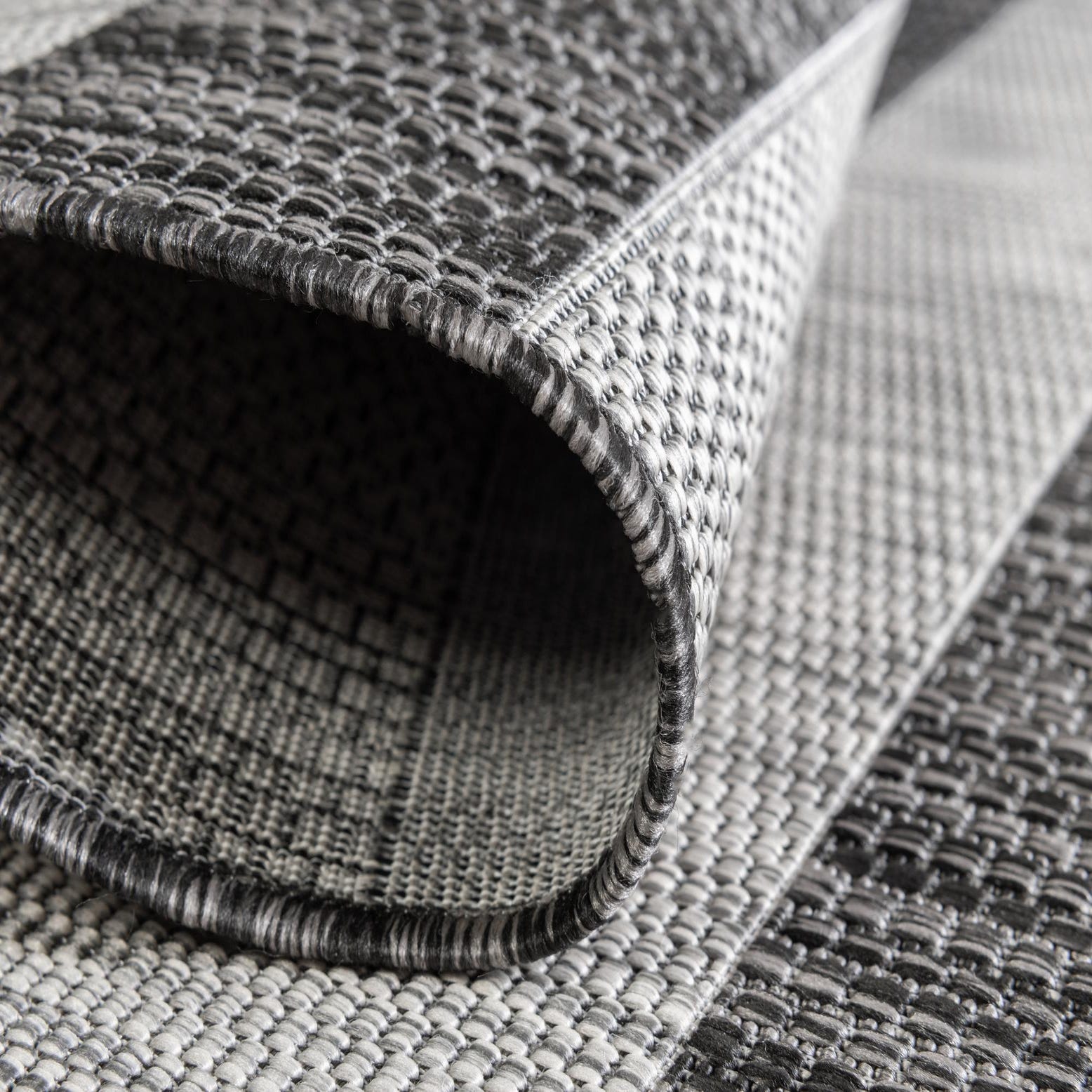Use this piece to anchor an outdoor dining area or a covered porch seating group, or place it beneath a round bistro table to define the space. Its neutral charcoal, gray and ivory palette complements natural woods, woven rattan or metal furniture and pairs well with crisp white linens or soft, muted accent pillows. The graphic stripe works equally well in contemporary, coastal-modern or transitional settings where a restrained, structured pattern is desired.