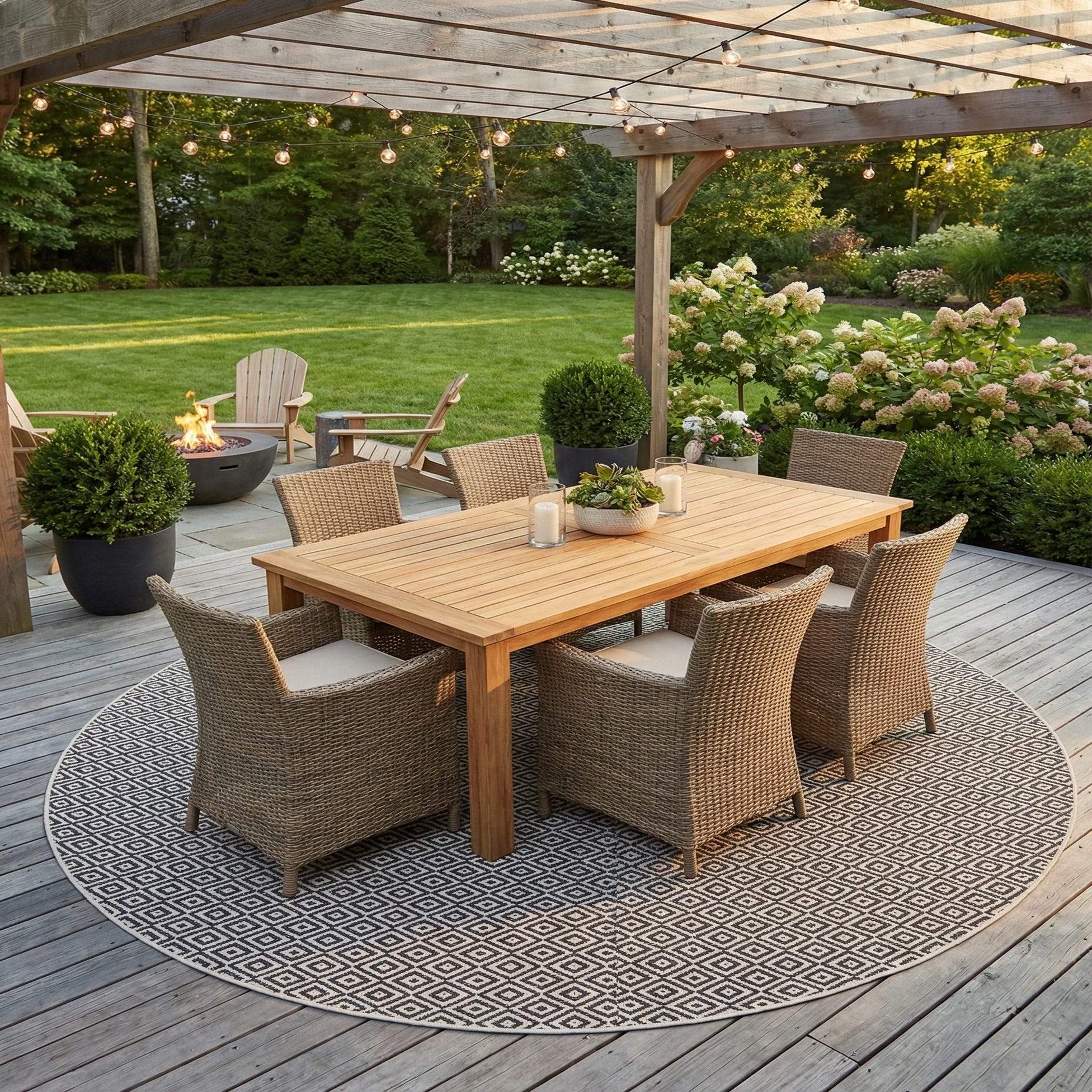 This piece works well on a covered patio or screened porch to anchor a conversation area, or inside a sunroom, entryway, or kitchen where its round shape softens straight lines. Pair it with light wood furnishings and woven accents for a relaxed coastal feel, or layer it with monochrome textiles and metal finishes for a contemporary, minimalist look.