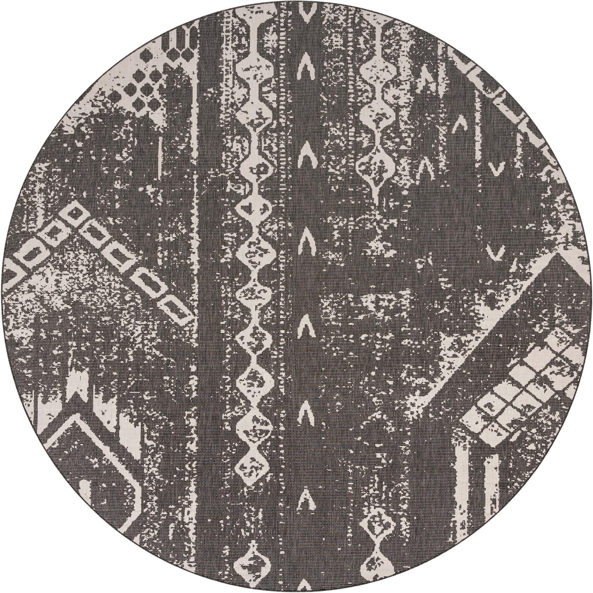 A 13' round black and gray abstract rug with distressed white geometric patterns, suitable for indoor or outdoor use.