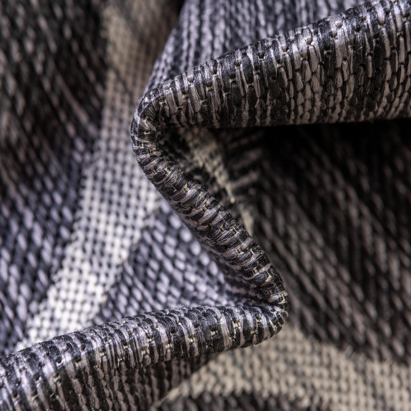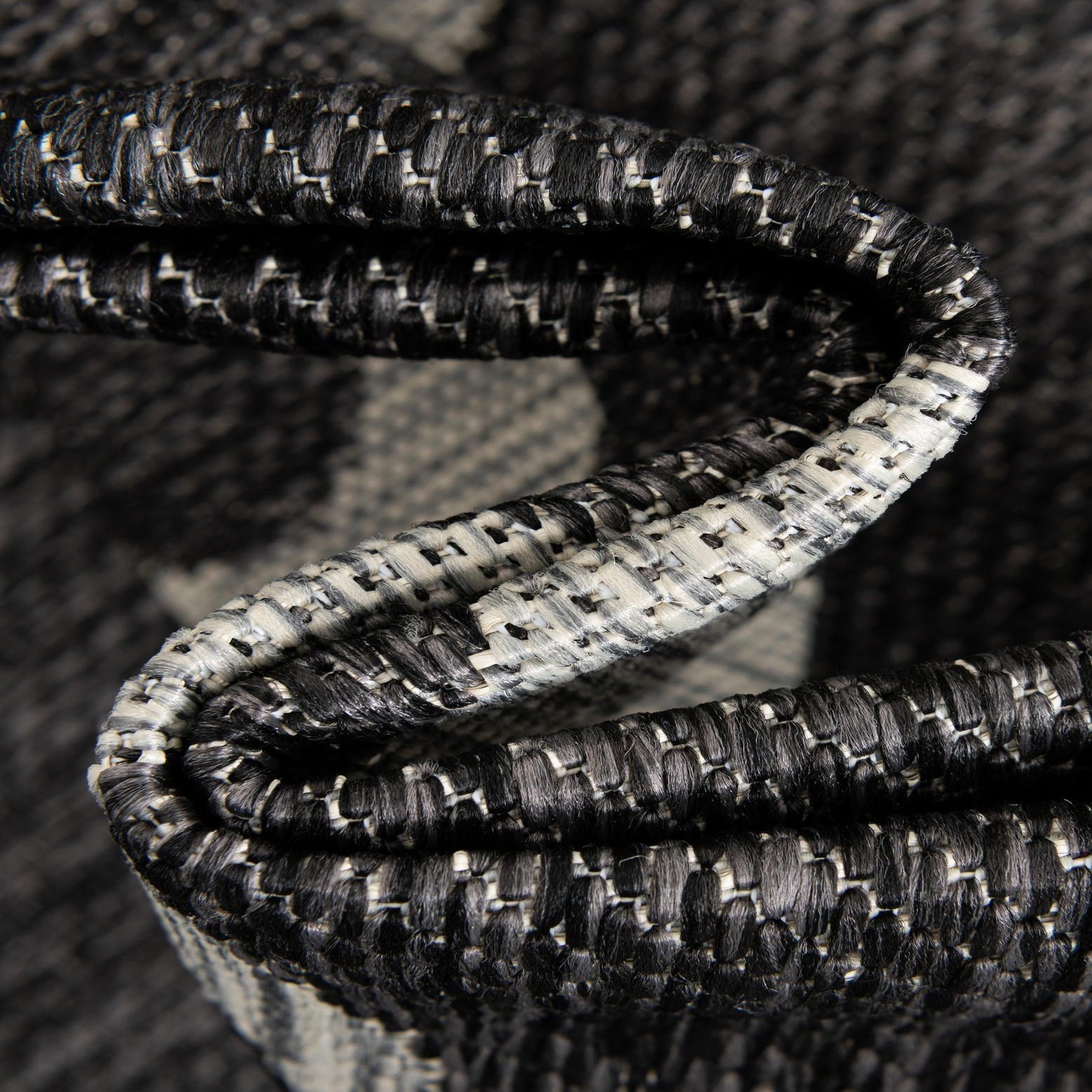 A 13' round black and gray botanical rug with an intricate swirling floral pattern, suitable for indoor or outdoor use.