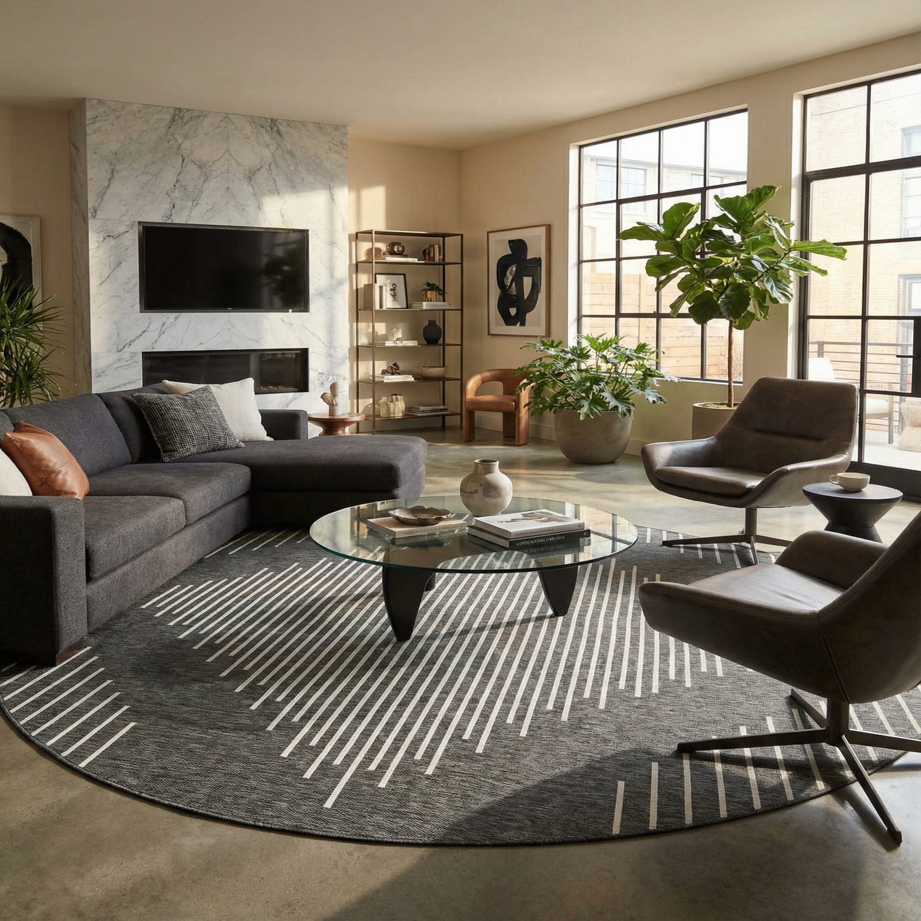 This 13 Ft Round area rug from the Outdoor Modern Collection presents a dynamic visual appeal with its bold geometric pattern. Crafted with precision, the machine-woven 100% polypropylene composition ensures durability and longevity, making it an ideal choice for high-traffic areas both indoors and outdoors. The rug features a charcoal gray background with a contrasting ivory linear pattern, which provides a modern and sophisticated look.