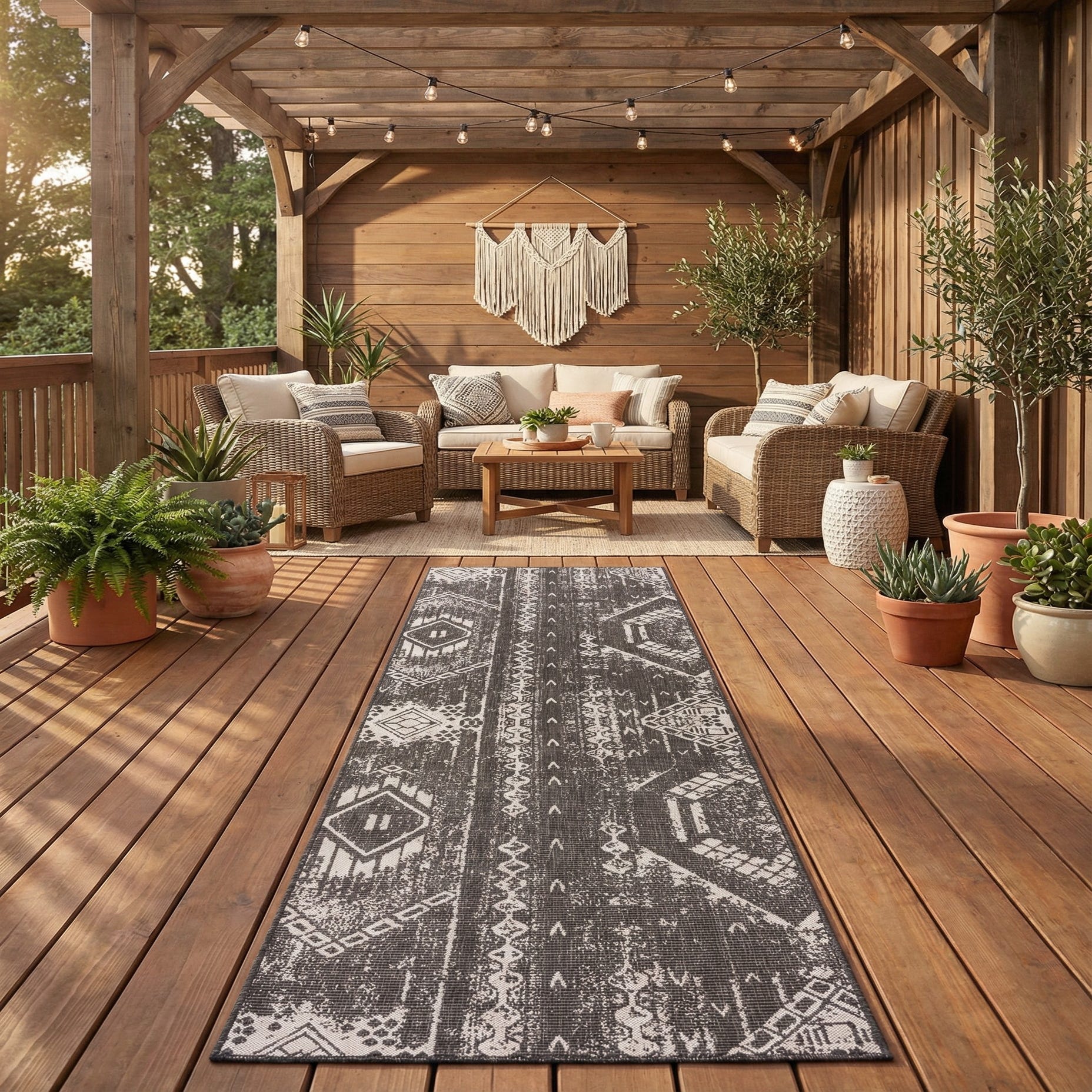 Part of the Outdoor Bohemian collection, this 14-foot runner rug is a durable and stylish addition to any space. Machine-woven from 100% polypropylene, the rug features a pattern that blends traditional motifs with a modern sensibility. The charcoal gray background is overlaid with ivory designs, imparting a dynamic visual contrast that catches the eye while maintaining an air of sophistication.
