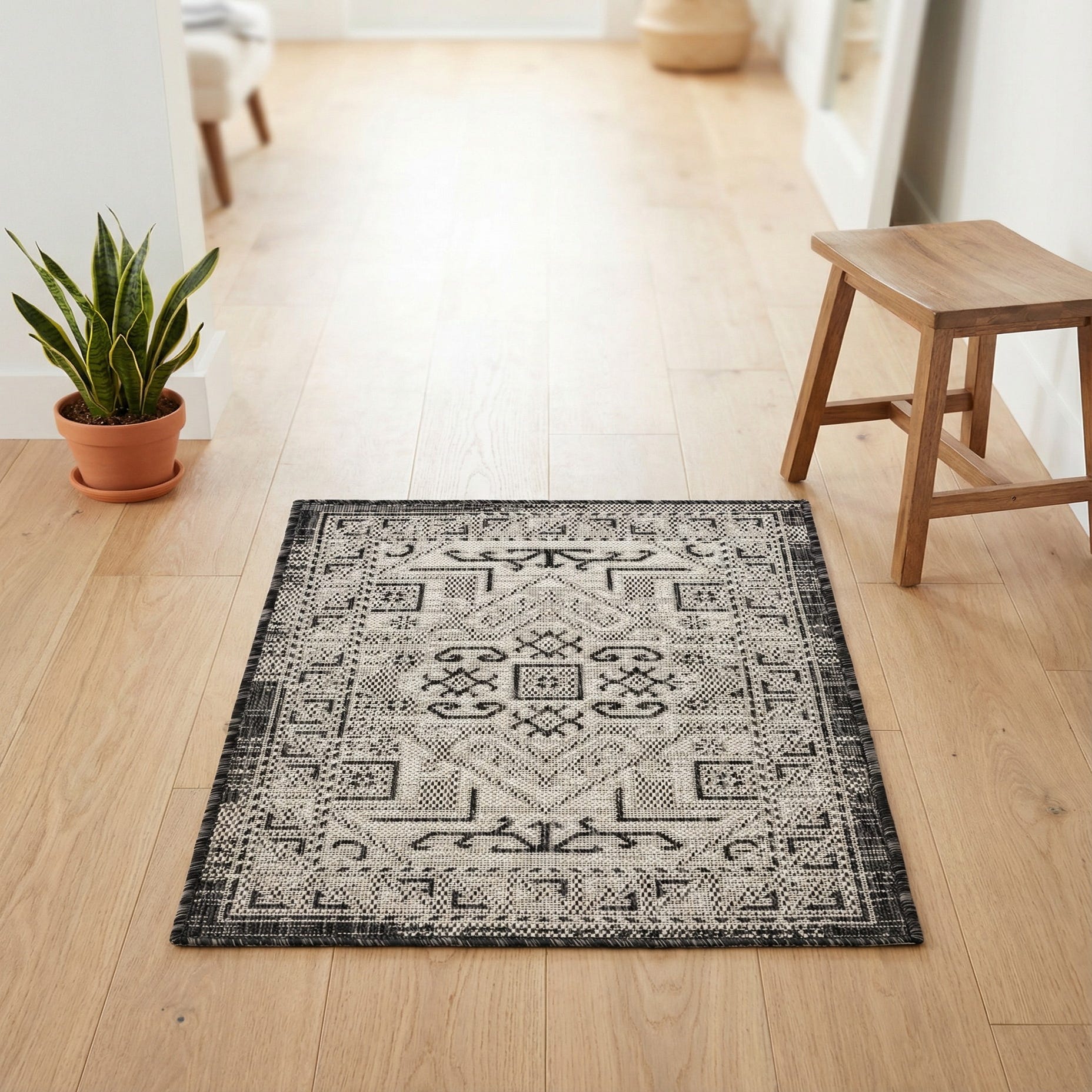Machine made from 100% polypropylene, the rug has a low-profile, flatwoven feel that lies firm underfoot and layers easily over outdoor decking or indoor flooring. Use it at an entry or on a small balcony to define a seating spot, place it in front of a kitchen sink for a touch of pattern, or layer it in a casual living area with natural woods and metal accents. It pairs well with modern farmhouse, industrial, or bohemian schemes—think rattan or leather seating, simple monochrome textiles, and warm wood tones to complement the charcoal and ivory palette.