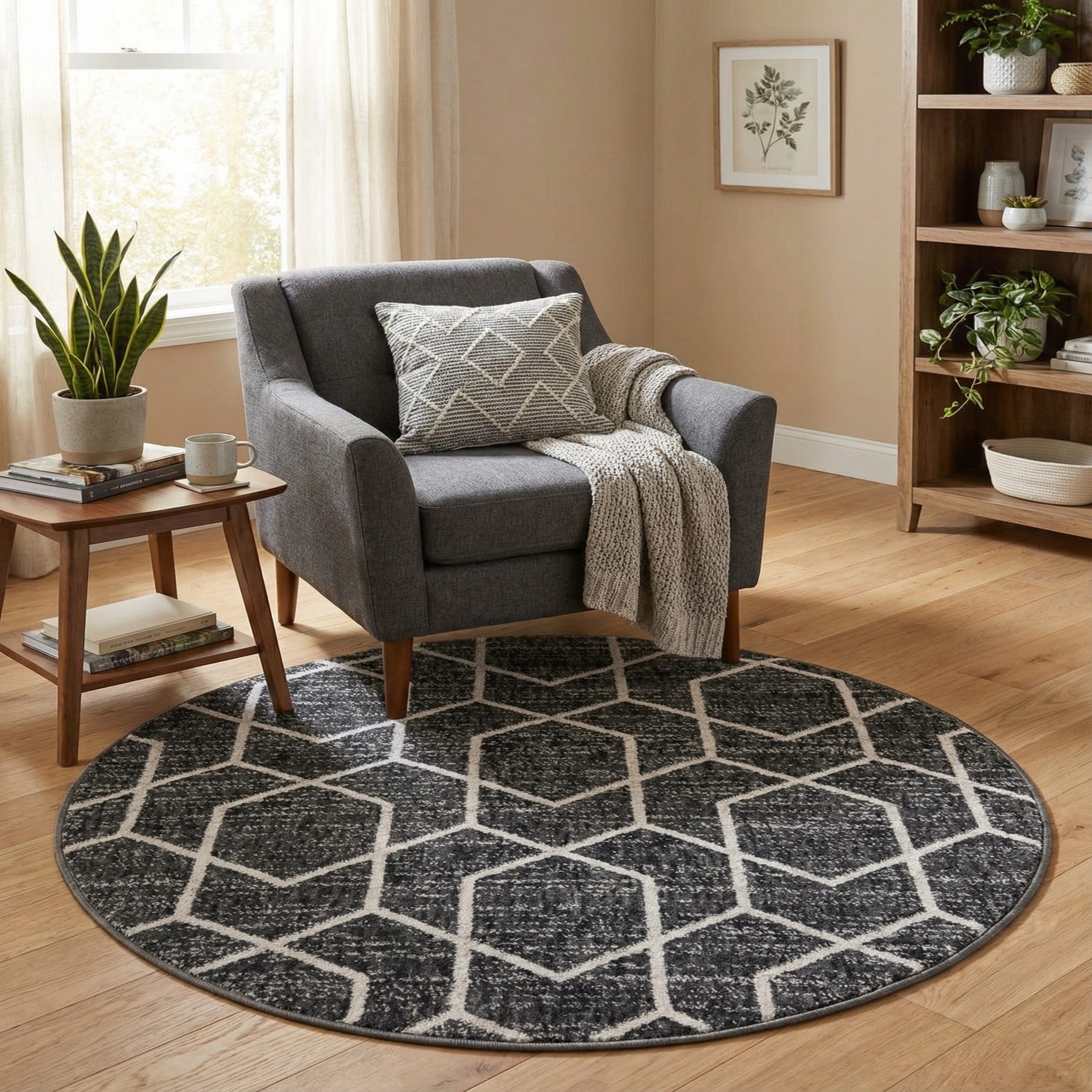 Place this round rug beneath a side table or in a cozy seating nook to define the area and add pattern without overwhelming the space. Its charcoal and ivory palette pairs well with light wood or black metal furniture, neutral upholstery, and layered textures like knit throws or leather accents. It’s also a good choice for a home office, entry, or den where a compact, stylish anchor is needed.