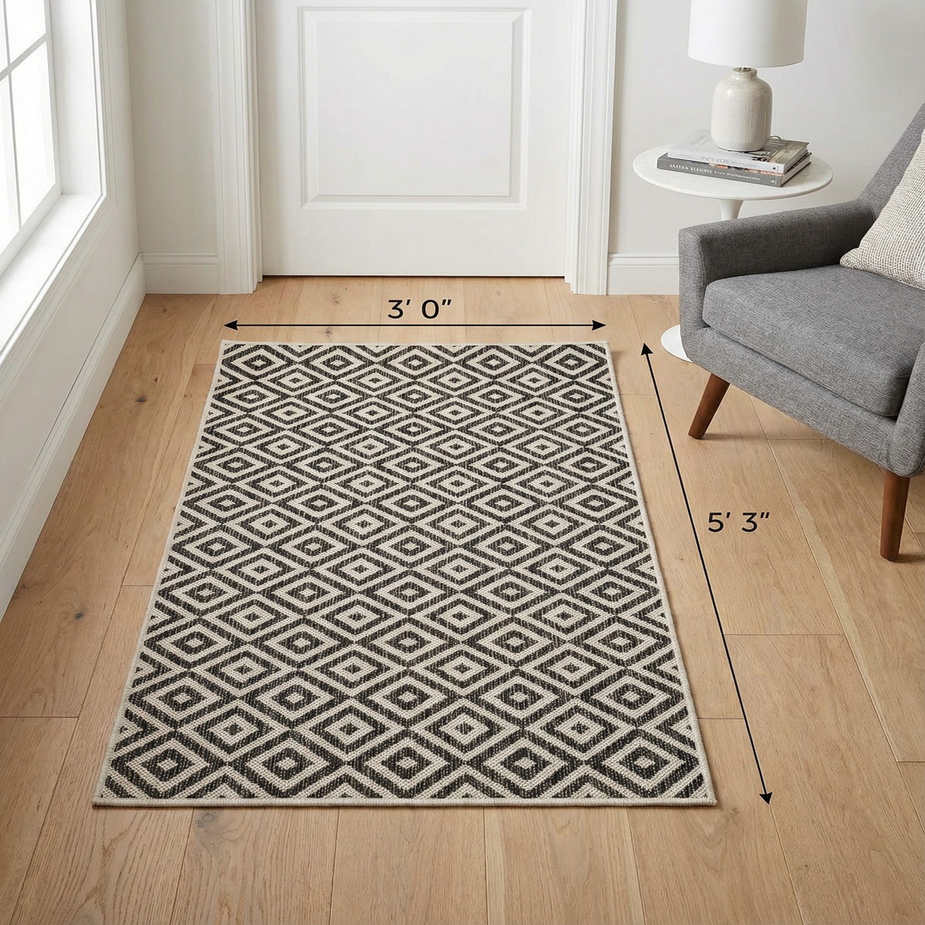 A bold charcoal gray field anchors a crisp geometric pattern of nested diamonds in clean ivory. The repeating lattice creates a steady, modern rhythm across the surface, with the ivory shapes sitting slightly raised against the darker background. Machine-made from 100% polypropylene, the rug has a low-profile flatweave that feels firm underfoot with a subtle textured grain from the tight weave—pleasant to the touch and visually layered without adding bulk.