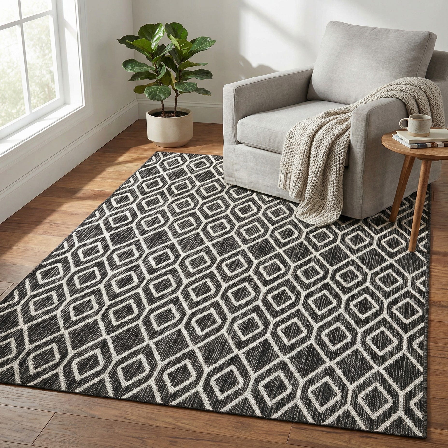 This outdoor-ready rug works well on a covered patio or front porch, layered beneath a bistro set, or placed in a mudroom or entry where a bold, graphic anchor is needed. The charcoal and ivory palette pairs cleanly with light- or dark-wood furniture, black metal frames, concrete or stone surfaces, and suits modern, coastal, or transitional settings that favor crisp, architectural patterns.