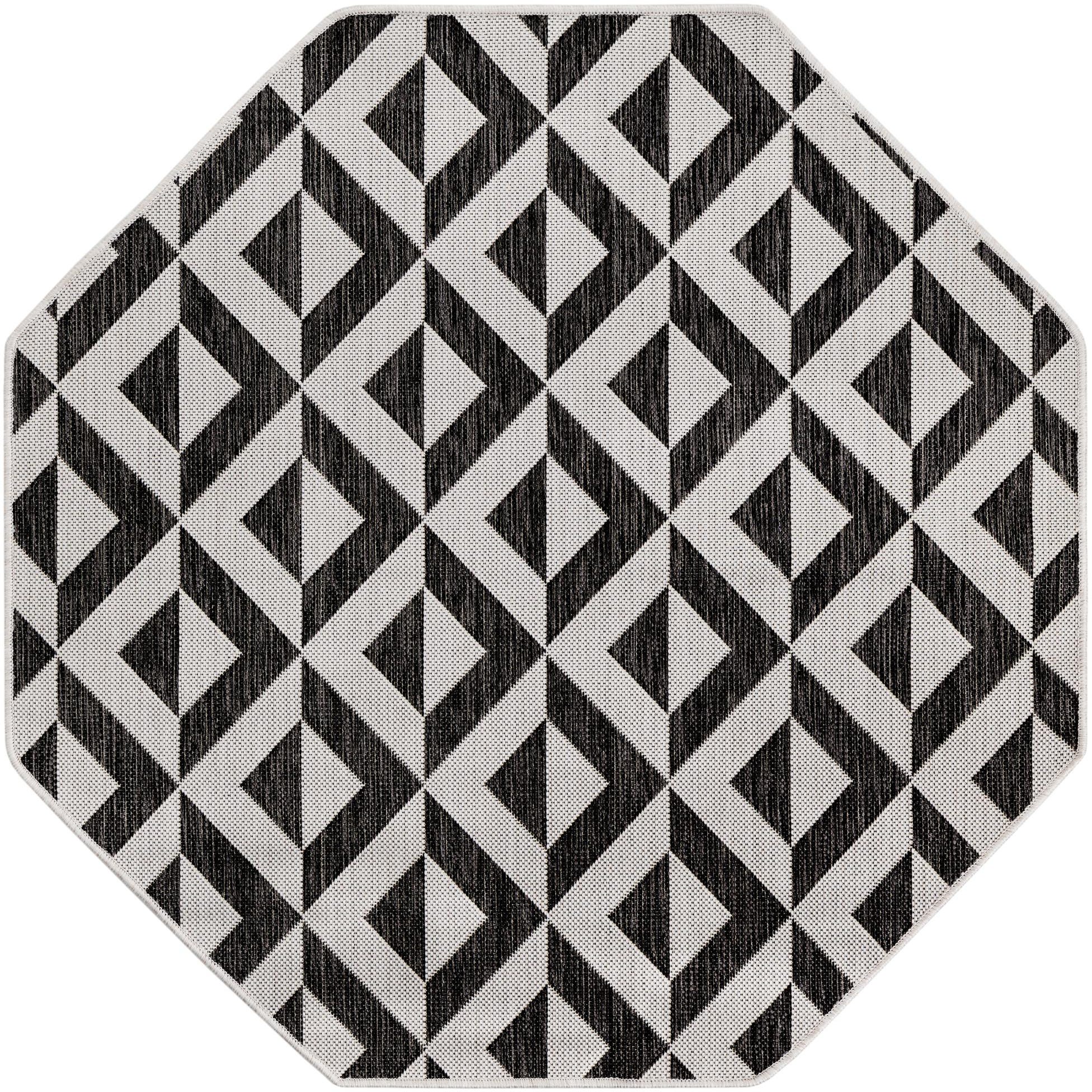An octagon-shaped black and white rug with a modern geometric trellis pattern, suitable for indoor or outdoor use.