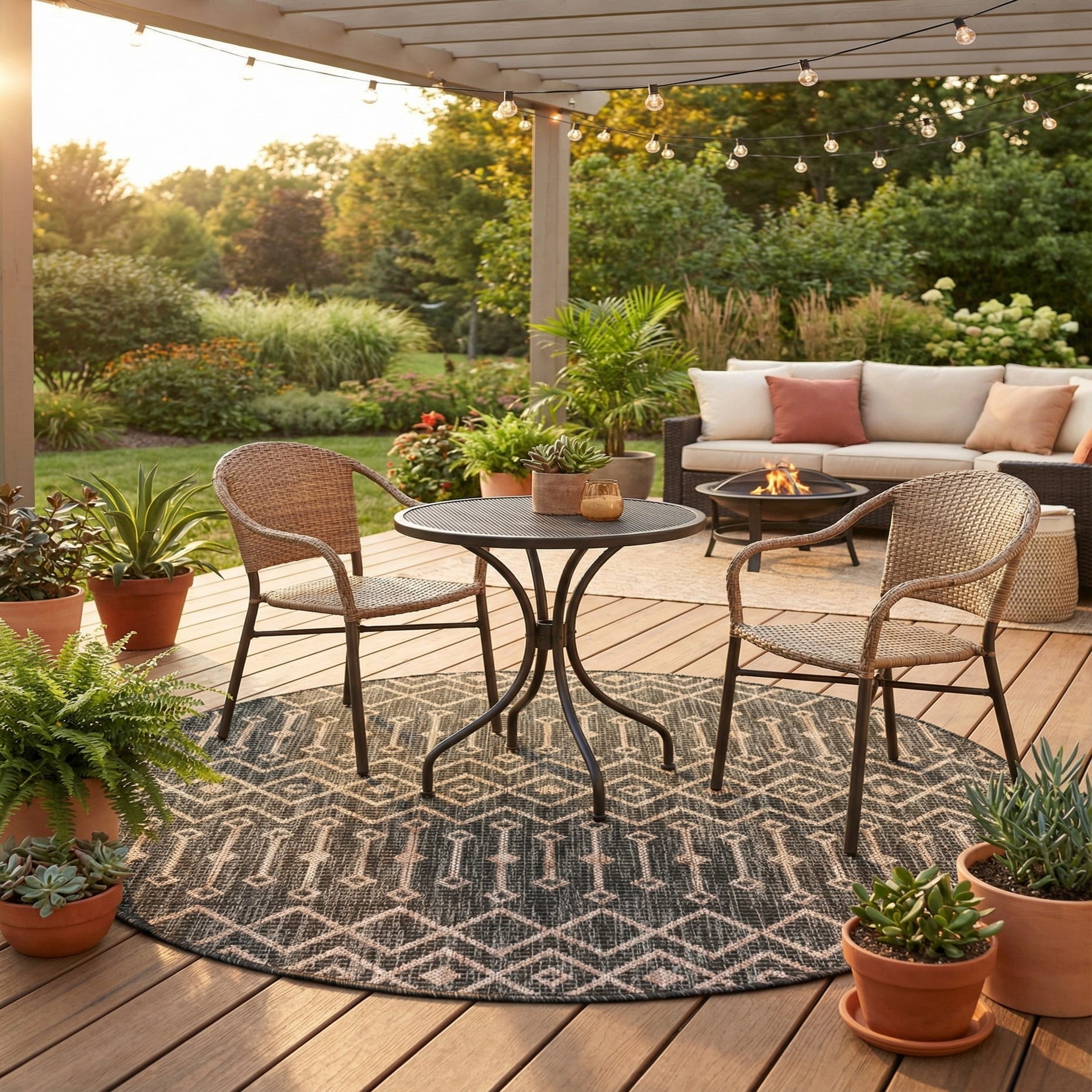 Machine-made from 100% polypropylene, the round shape has a low-profile, slightly textured hand that feels steady underfoot. Place it beneath a bistro set on a covered patio, at the base of a front door, or centered under a round dining table to anchor the space. It pairs easily with metal or weathered wood furniture, neutral linen textiles, and designs ranging from coastal and farmhouse to contemporary urban interiors.