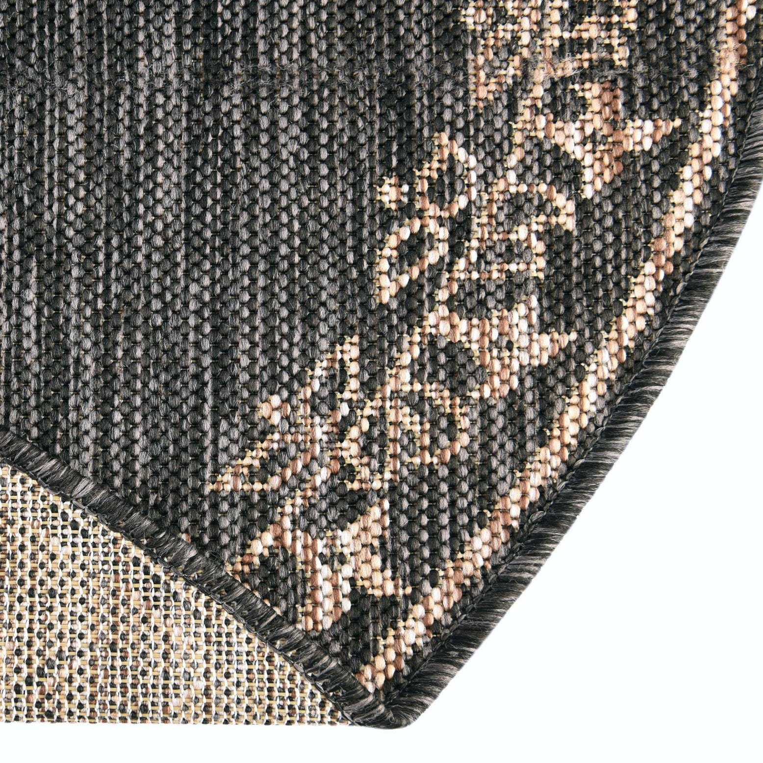 A 4' round black and gray indoor/outdoor rug with a central medallion and ornate border.