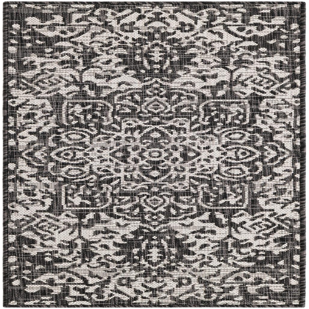 A 4 ft runner rug from the Jill Zarin Outdoor collection, featuring a distressed black and off-white traditional pattern.