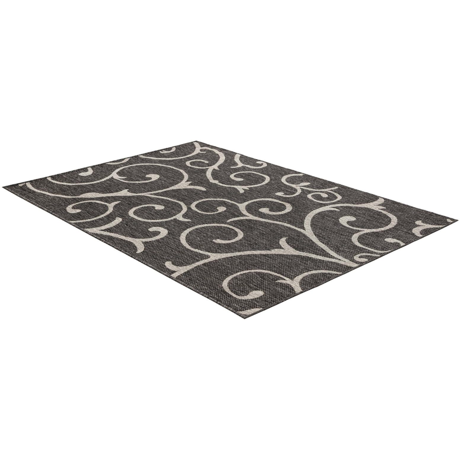 A rolling botanical scroll pattern unfurls across a deep charcoal gray ground, the graceful curls and tendrils rendered in a cooler gray for clear, graphic contrast. Machine-made from 100% polypropylene, the rug has a low, tightly woven pile with subtle vertical striations you can feel beneath your feet—smooth and slightly springy, with a flat surface that sits well under furniture and outdoor seating.