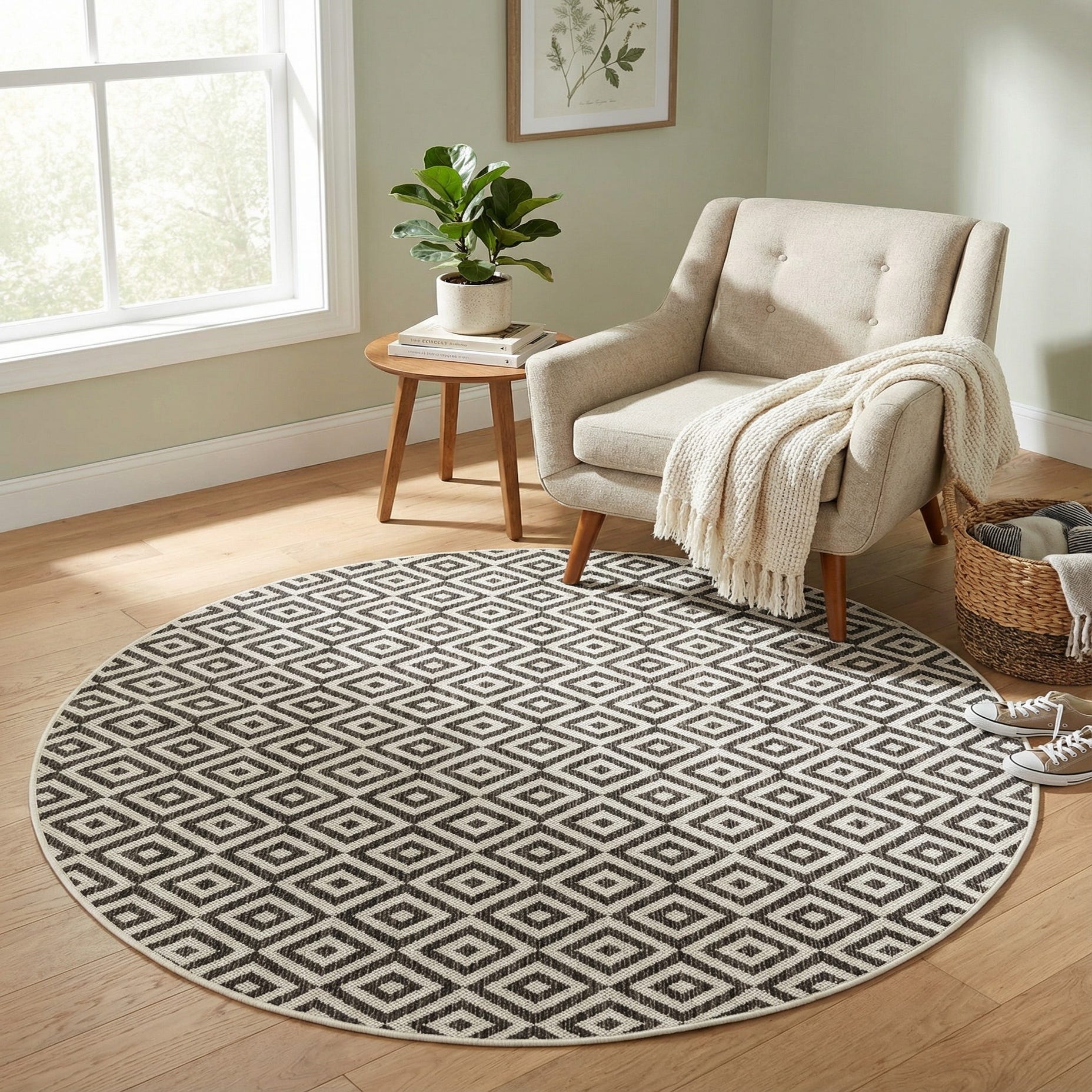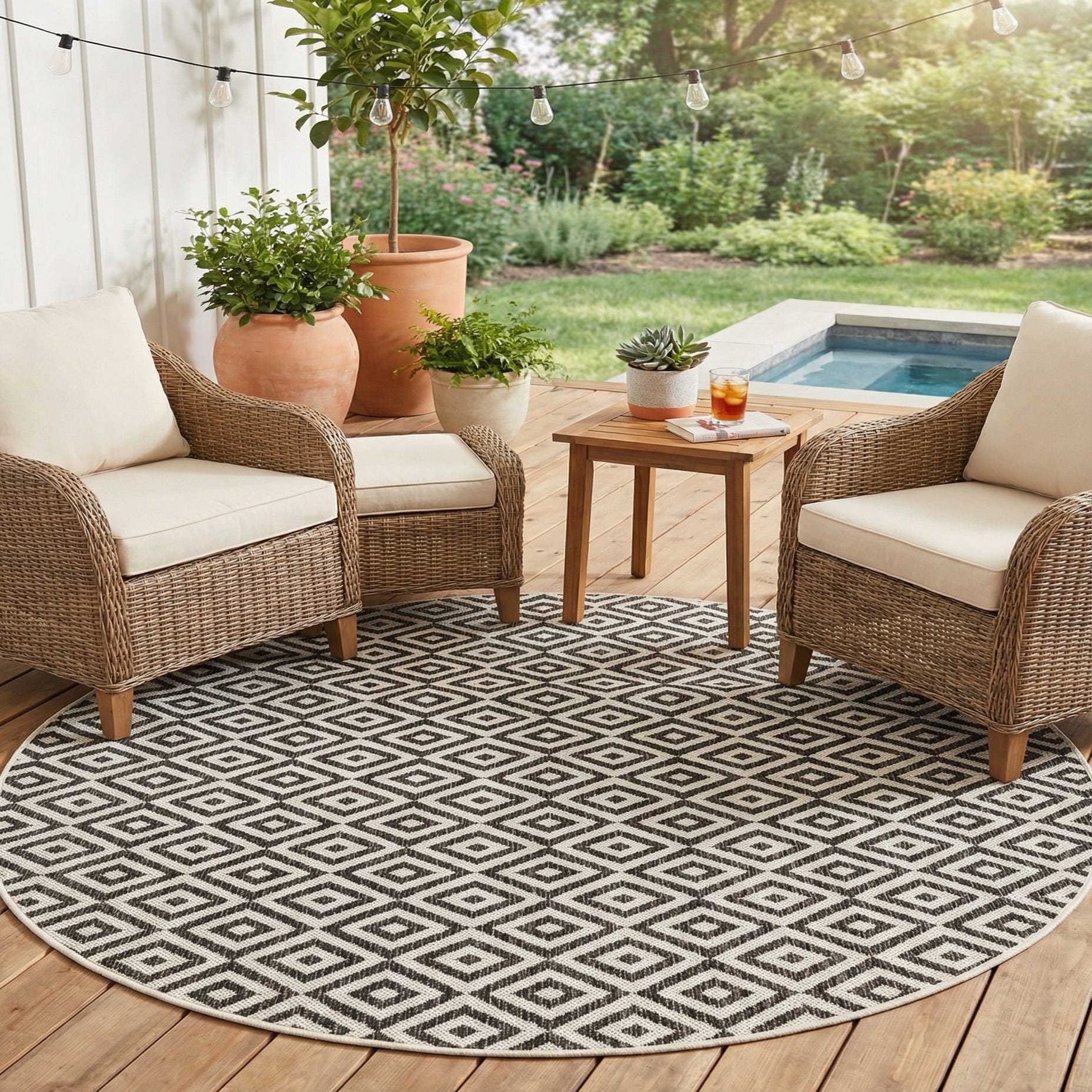 Place this round rug beneath a bistro table or use it to define an intimate seating area on a covered patio or balcony. It also works well under a circular dining table, in an entryway to ground a foyer, or layered over a larger indoor rug for contrast. The clean geometric pattern complements contemporary, Scandinavian, or modern farmhouse decor and coordinates nicely with natural woods, matte metals, and crisp white or ivory textiles.