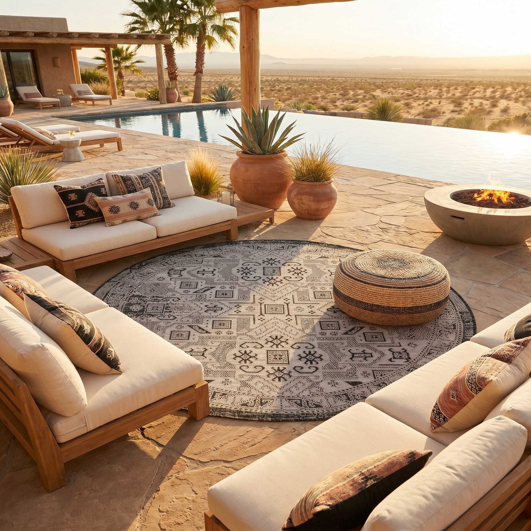 Loved this piece pictured and it arrived fast and looked exactly as pictured. We picked the square sized 7’10 and it fit perfect in the space. While I can’t say as of yet how it fares with wear and tear this is my second purchase of an outdoor rug from rugs.com and my first rug weathered the seasons amazingly. Still in perfect condition a year later and only replaced with this one because I wanted to add a little more color.