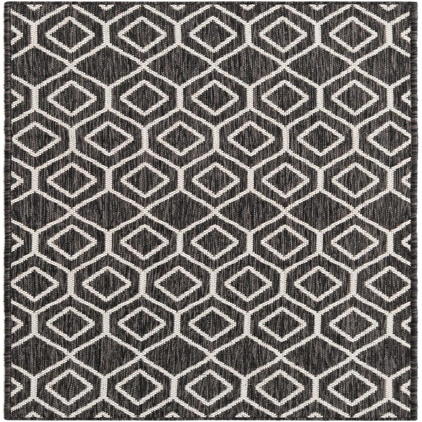A 5 ft runner rug featuring a modern black and white trellis pattern, suitable for hallways or patios.