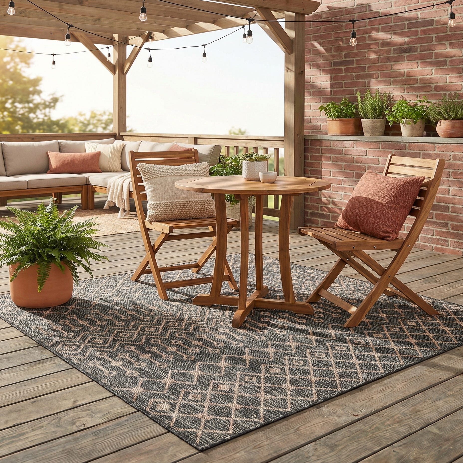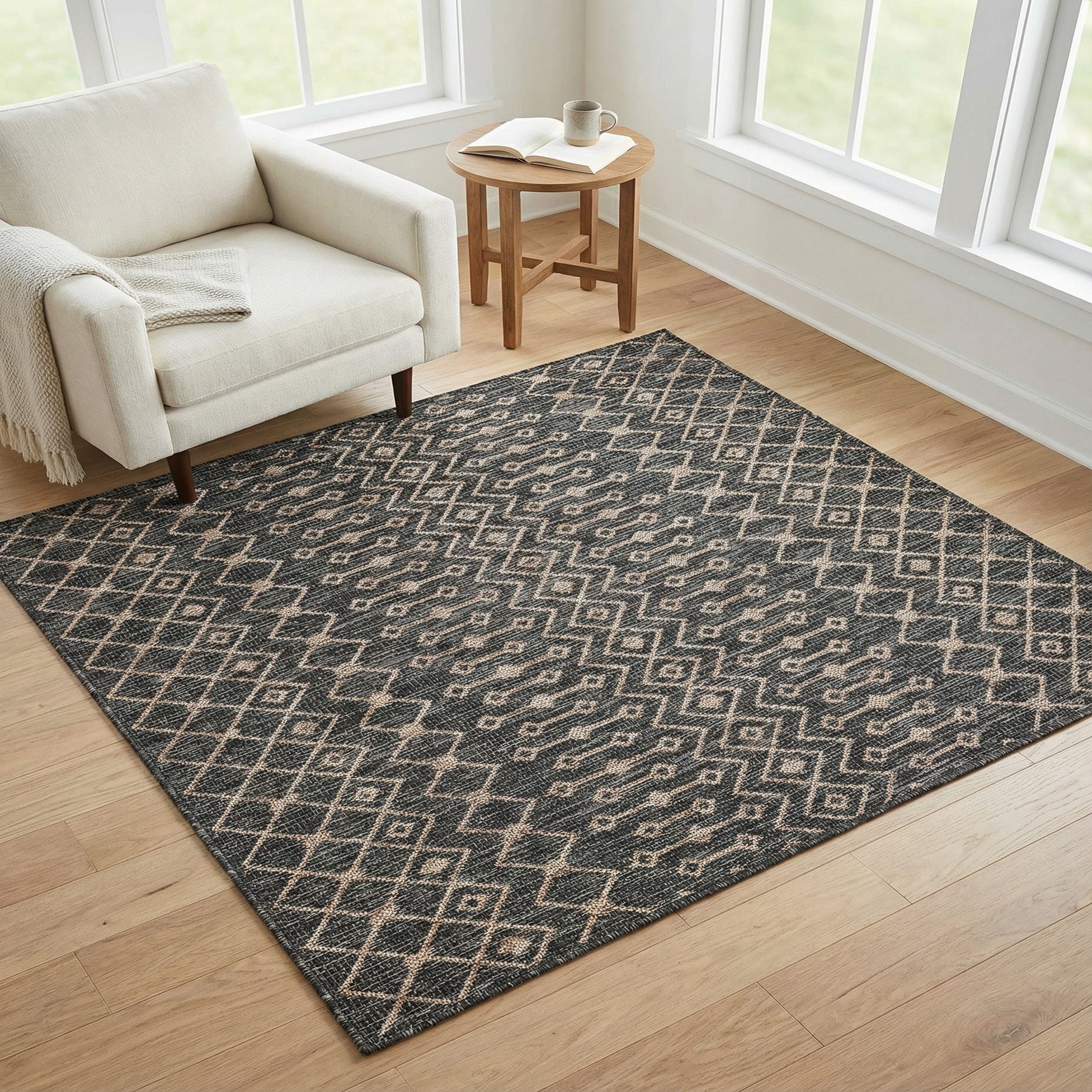 Machine-made from 100% polypropylene, the rug has a low, tightly woven pile that feels firm and slightly textured beneath your hand. That flat surface makes it a practical choice for high-traffic zones: place it on a covered patio, under an outdoor dining set, in an entryway, or layered on a sunroom floor. Pair it with warm wood furniture and neutral textiles for a cozy, natural palette, or use it to anchor metal and concrete pieces in a contemporary outdoor living area.