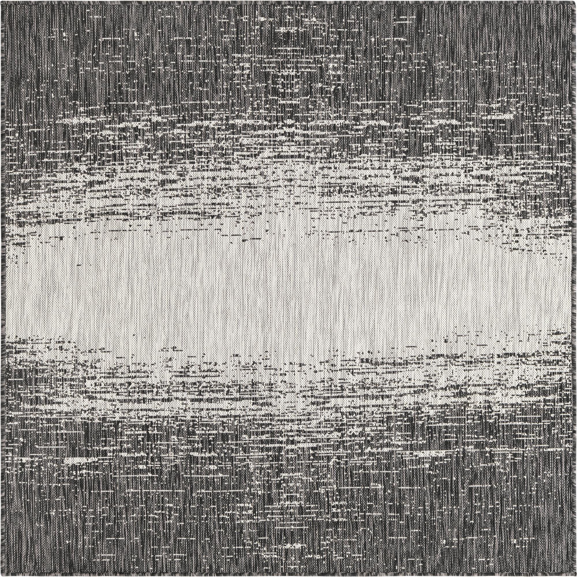 A 5'3" x 5'3" square black and gray flatweave rug with a modern, distressed stripe pattern, suitable for indoor or outdoor use.