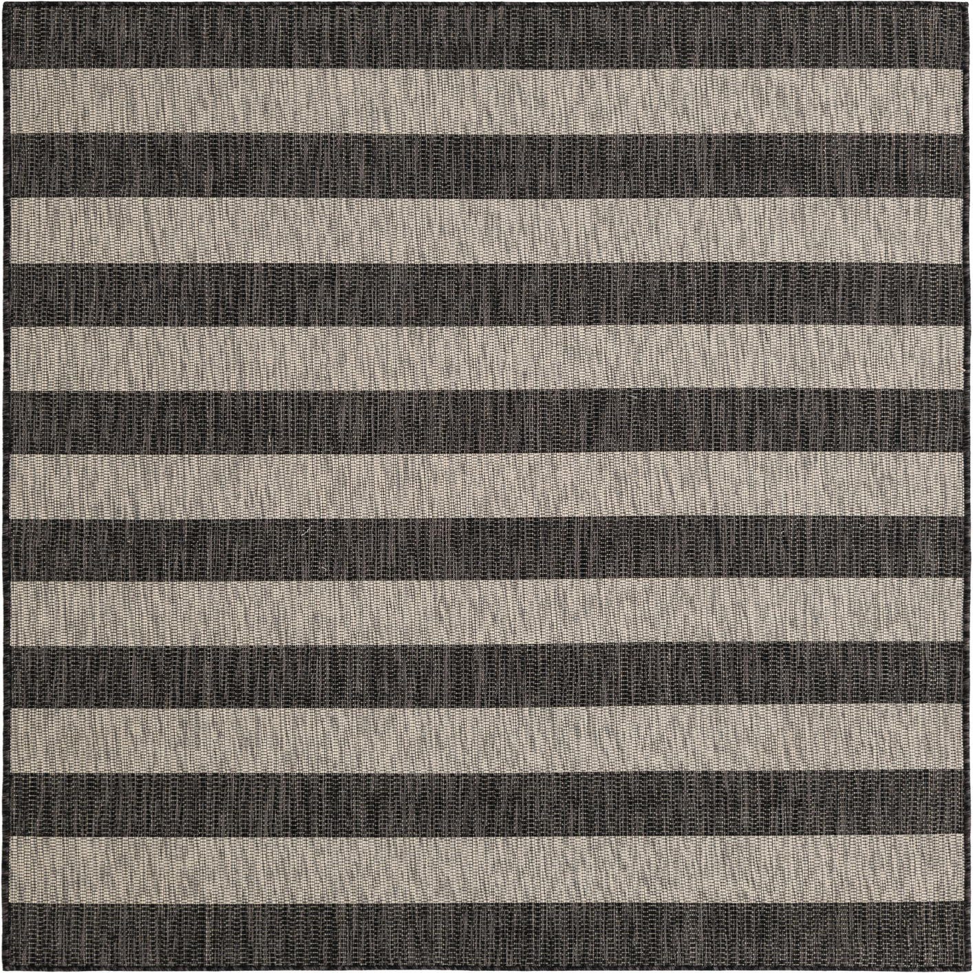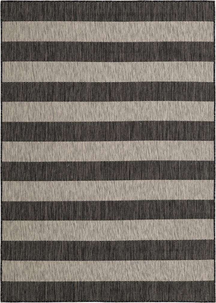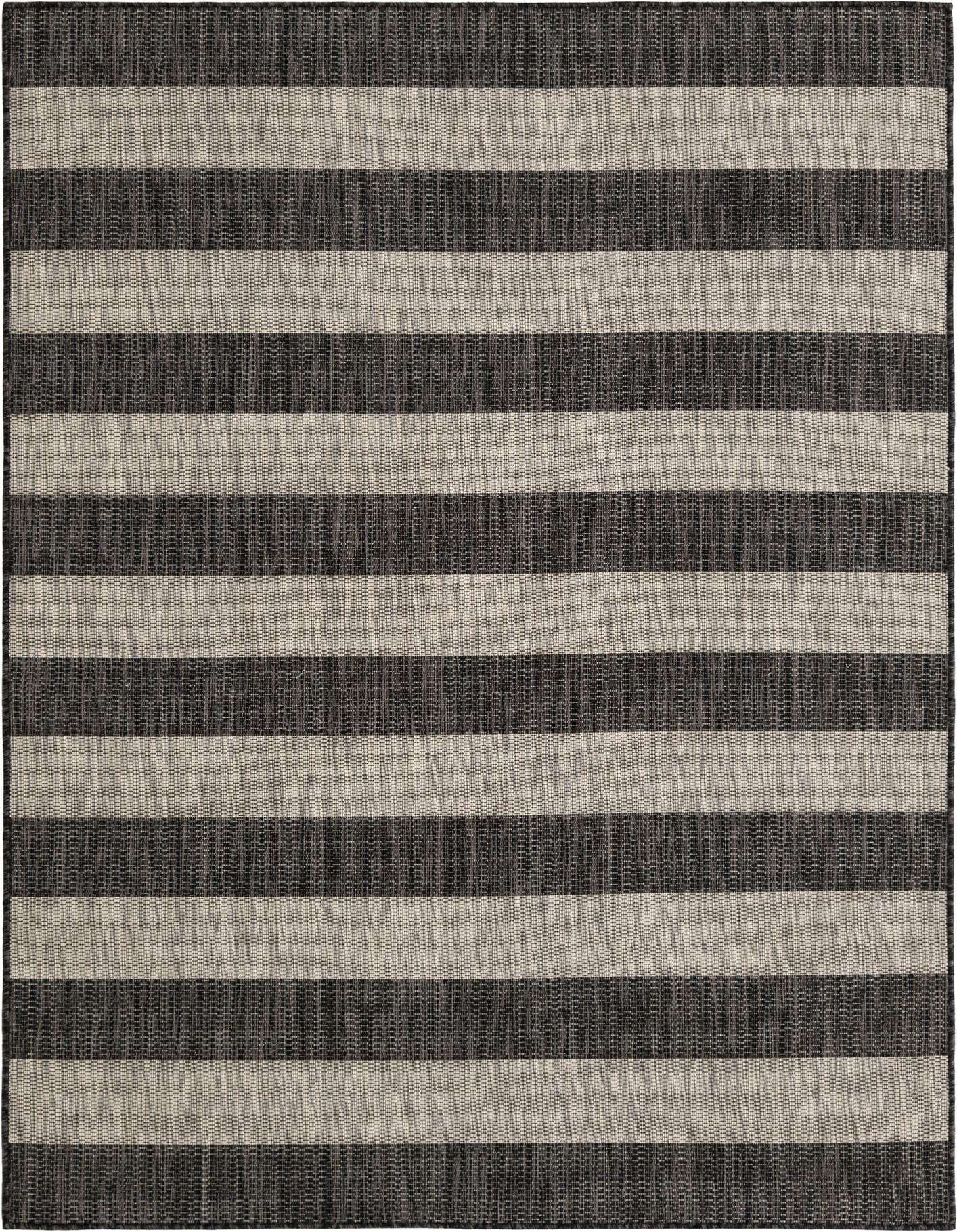 A 5x7 rectangular black and gray striped outdoor rug with a flatweave texture, suitable for a patio.