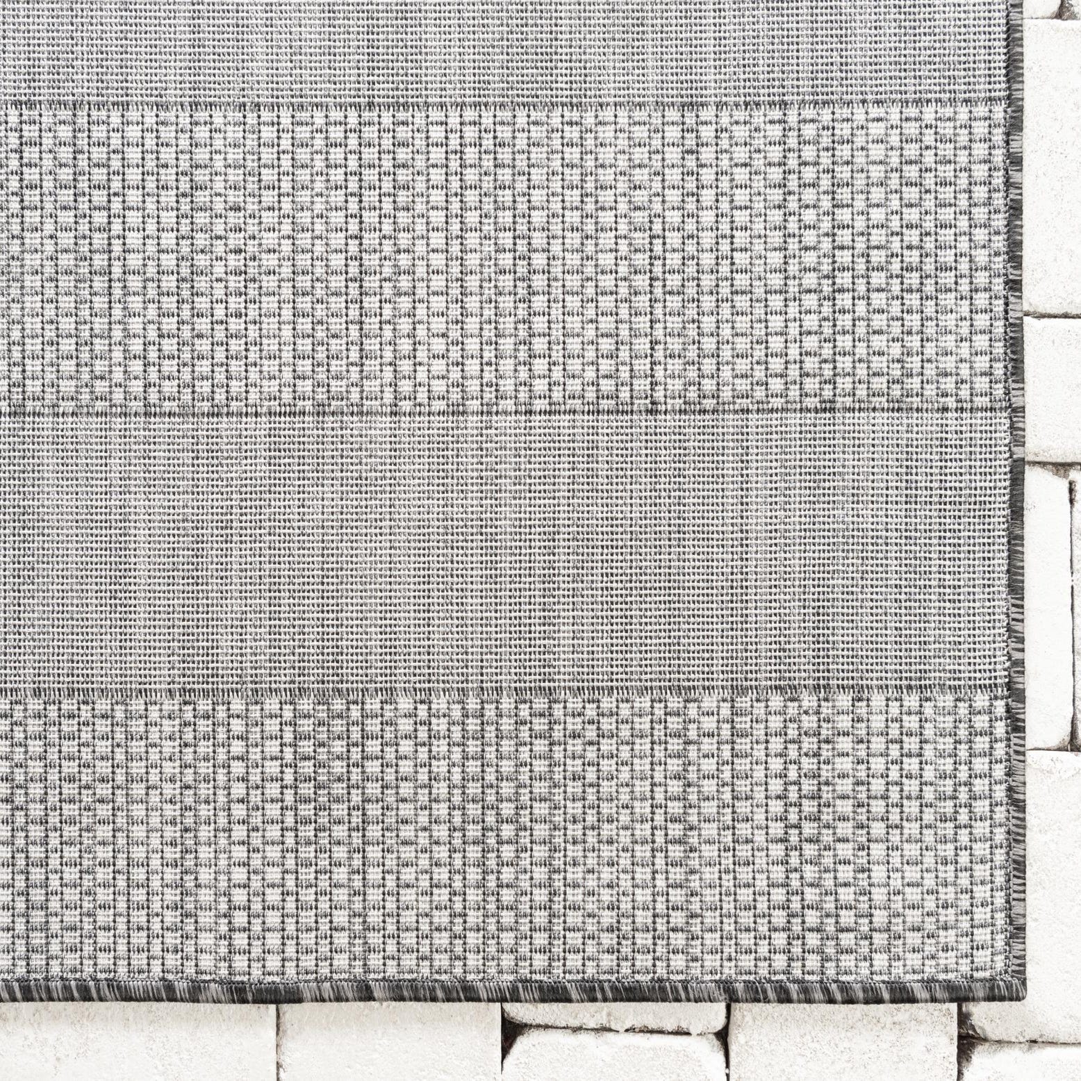 This rug pairs easily with contemporary, coastal, or minimalist decor — think metal or wicker seating on a covered patio, a sleek dining table, or a living room arrangement with light wood floors and neutral upholstery. Its bold stripes work well to define seating areas or anchor a casual dining set, and the flatweave texture layers nicely beneath furniture without adding height. The charcoal, gray, and ivory palette provides a versatile foundation for both cool and warm accent pieces.