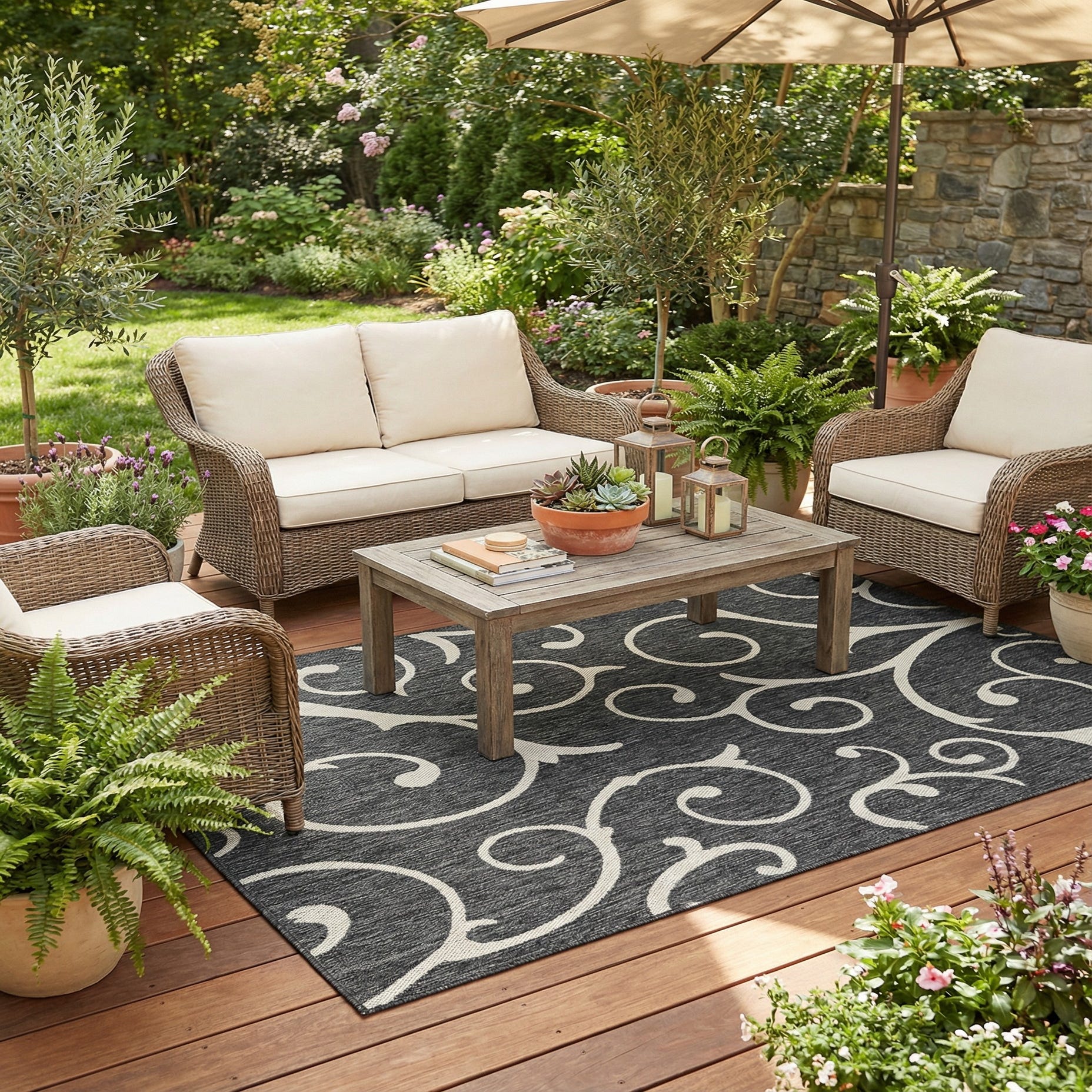 The charcoal background anchors neutral and monochrome palettes while the gray pattern adds visual movement. Pair this rug with metal-framed seating for a contemporary patio arrangement, place it beneath a coffee table to ground a living room, or set it in an entryway to introduce pattern without overwhelming a compact space. Its low-profile weave works well with both indoor and covered-outdoor furniture styles, from wicker and wood to leather and linen.
