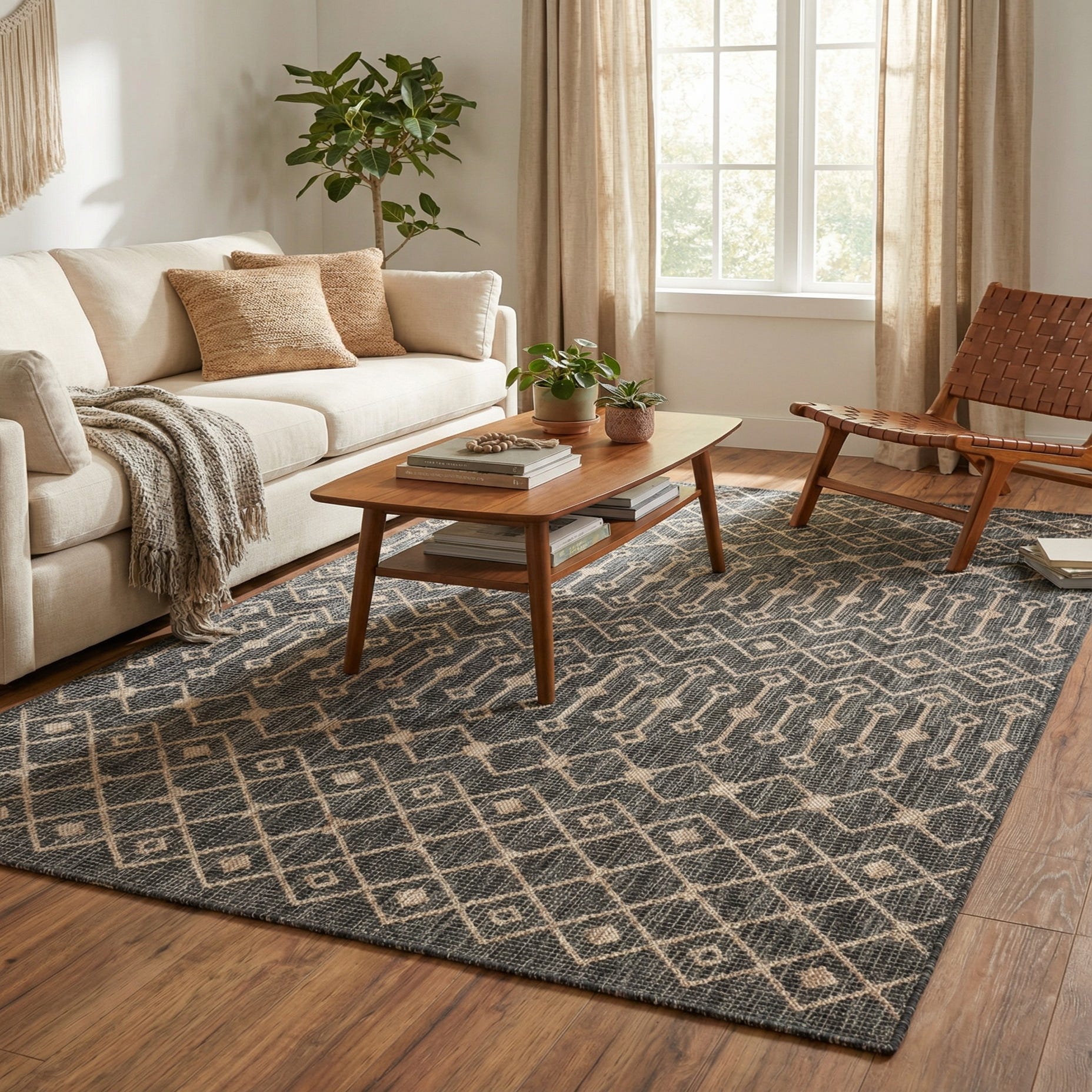 This graphic, neutral palette works well in modern, transitional, or farmhouse-inspired spaces. Use it to anchor a conversation area on a covered patio, define an outdoor dining spot, or set a confident tone in an entryway; it pairs nicely with clean-lined furniture, weathered woods, and woven accents for a layered, pulled-together look.