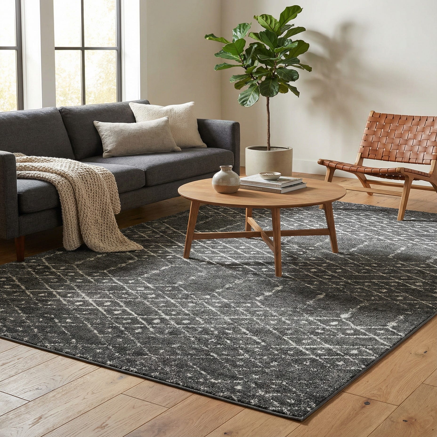 Machine-made of 100% polypropylene, the rug has a low, dense pile that feels soft underfoot and shows a subtle high-low texture where the pattern is slightly raised against the darker ground. Place it beneath a coffee table in a contemporary living room, use it to anchor a seating group in a loft or industrial-style space, or layer it under a casual dining table to bring pattern without overwhelming the room. It also pairs well with neutral leather, warm wood tones, and cool metal accents for a balanced, modern look.