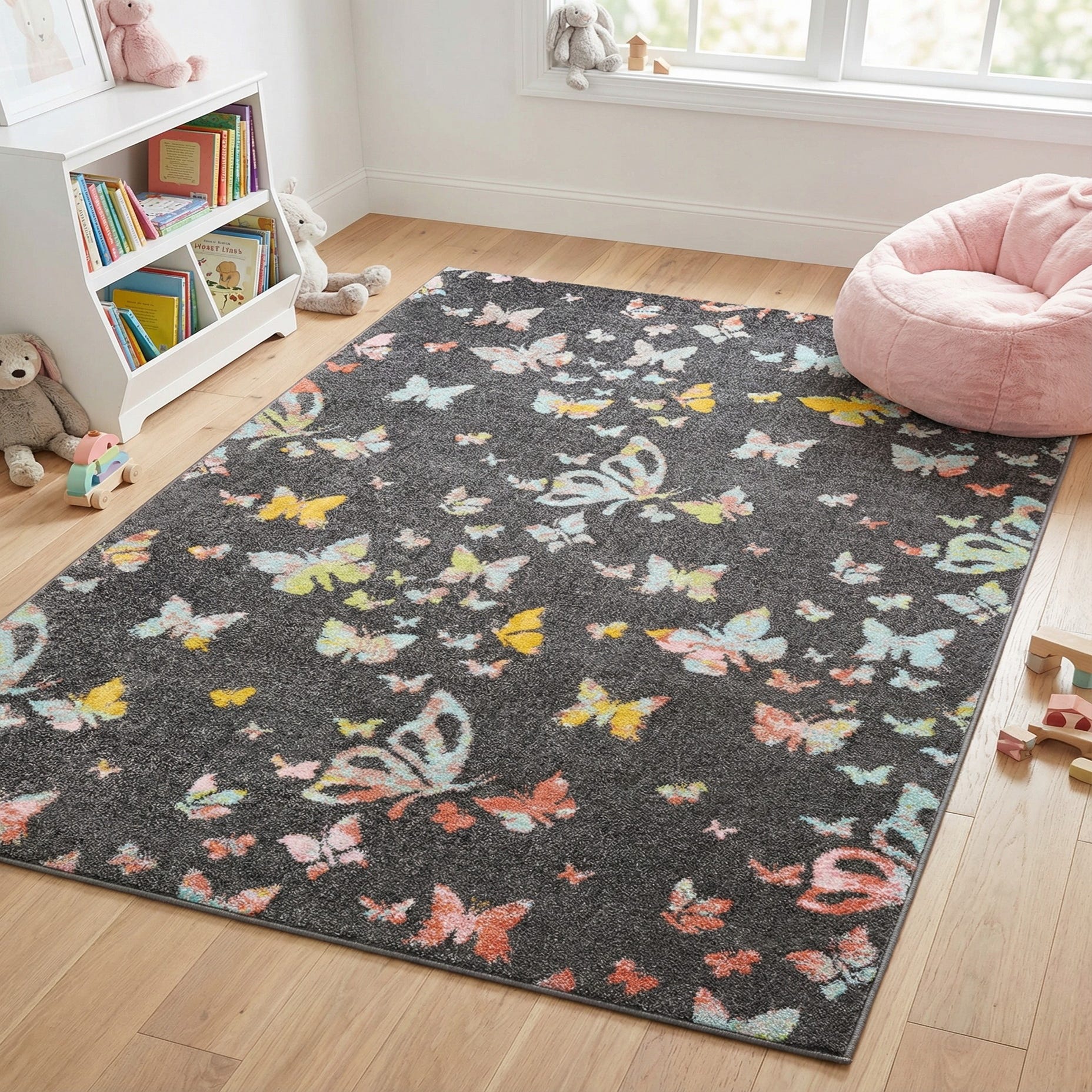 Primary color is Charcoal Gray. Colors in this rug include: Charcoal Gray, Blue, Green, Ivory, Pink, Yellow.