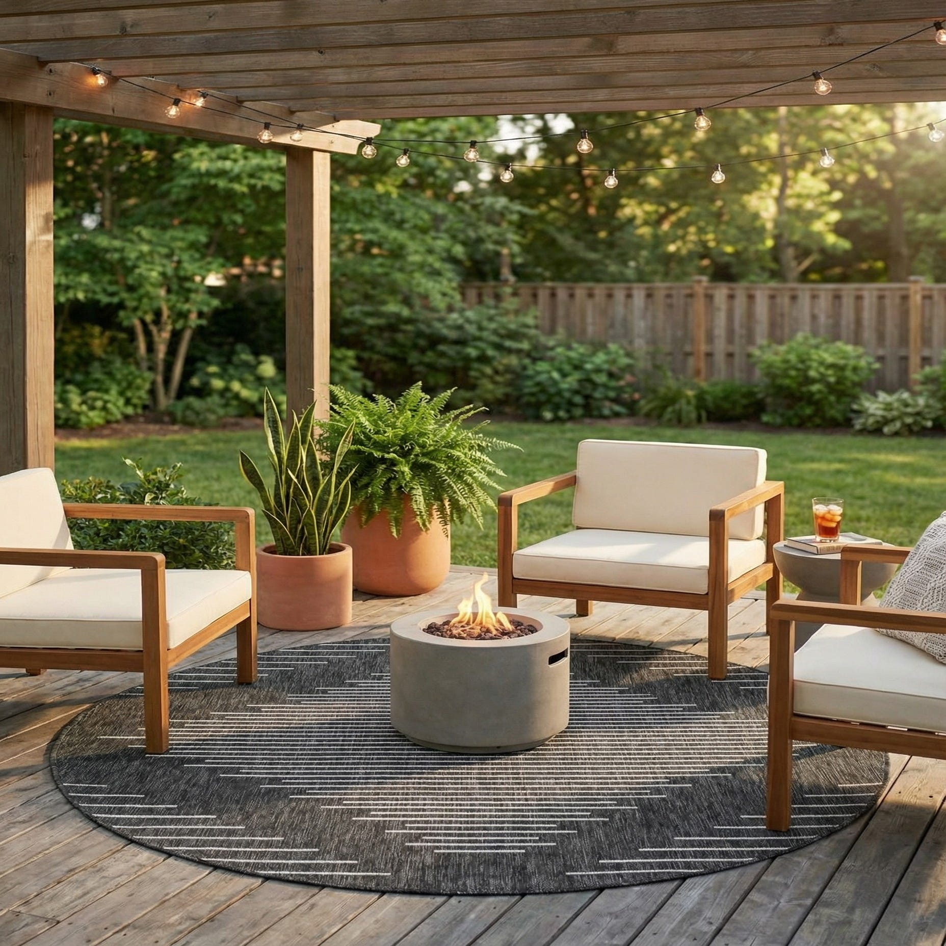 A round black and gray outdoor rug with a modern Southwestern-inspired white striped diamond pattern.