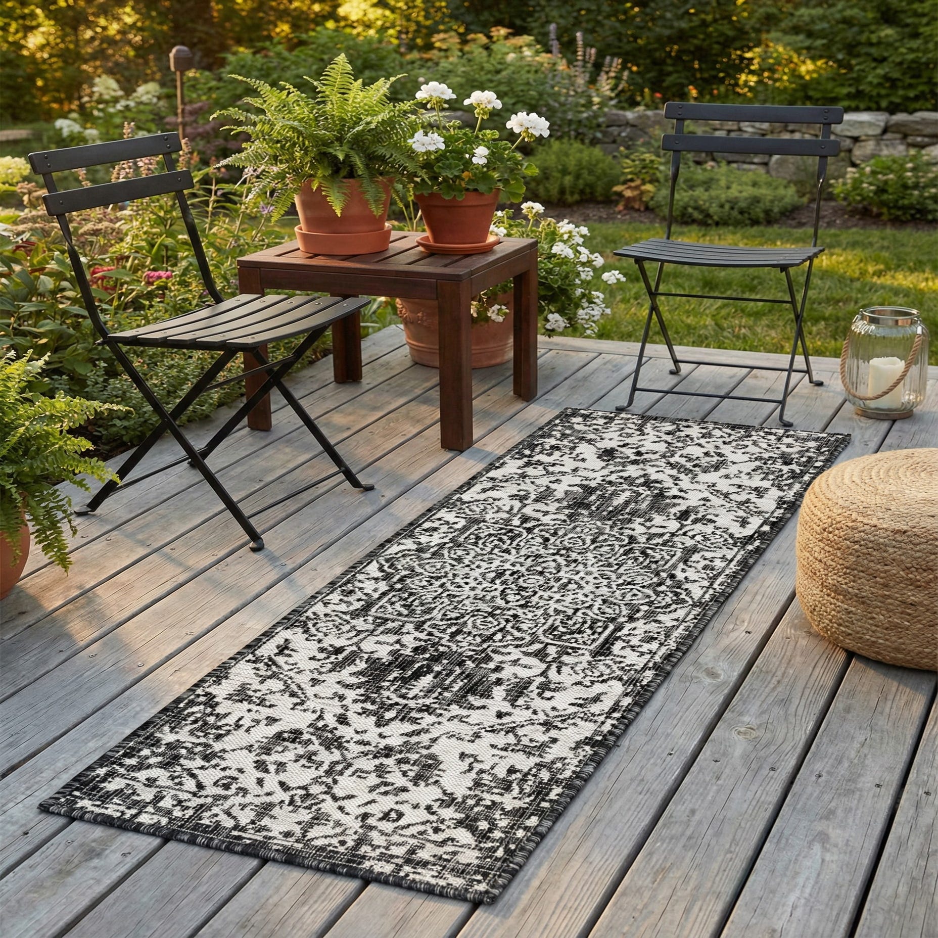 Machine-made from 100% polypropylene, the rug has a low-profile, tightly woven surface with a subtle texture underfoot. That construction makes it well suited to busy zones—place it in a hallway or entry, layer it in a narrow kitchen, or use it to anchor seating on a covered patio. The neutral charcoal-and-ivory palette pairs easily with modern farmhouse, transitional, or monochrome interiors and complements both light wood and dark metal furnishings.