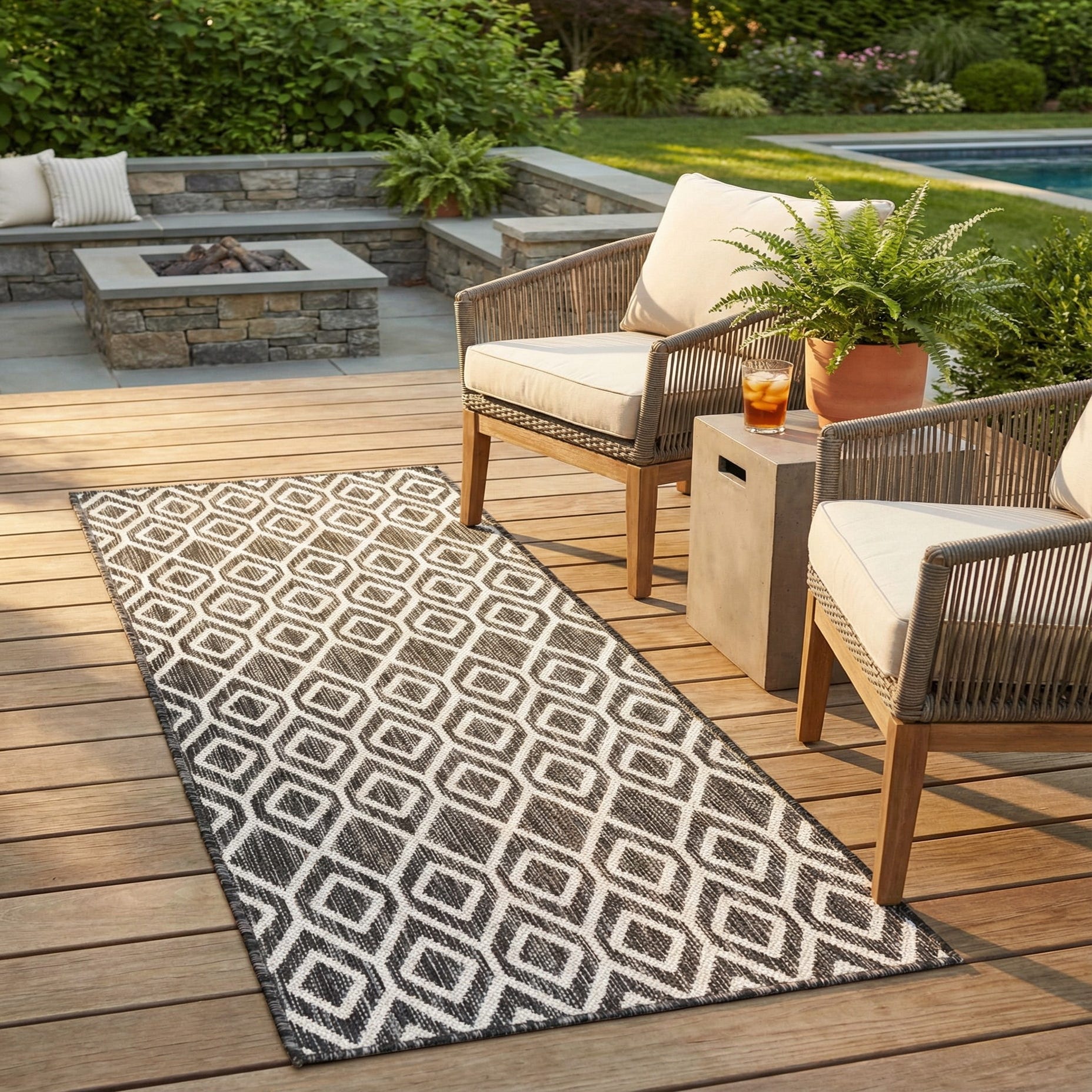 This runner works well in narrow spaces where you want visual rhythm—hallways, entryways, galley kitchens, or covered porches. Pair it with pale wood floors and matte black or brushed metal accents for a contemporary scheme, or use it as a neutral anchor in coastal and transitional interiors alongside woven baskets and light linens. Its outdoor-capable construction also makes it a practical choice for covered patios and high-traffic corridors where a clean, geometric statement is needed.