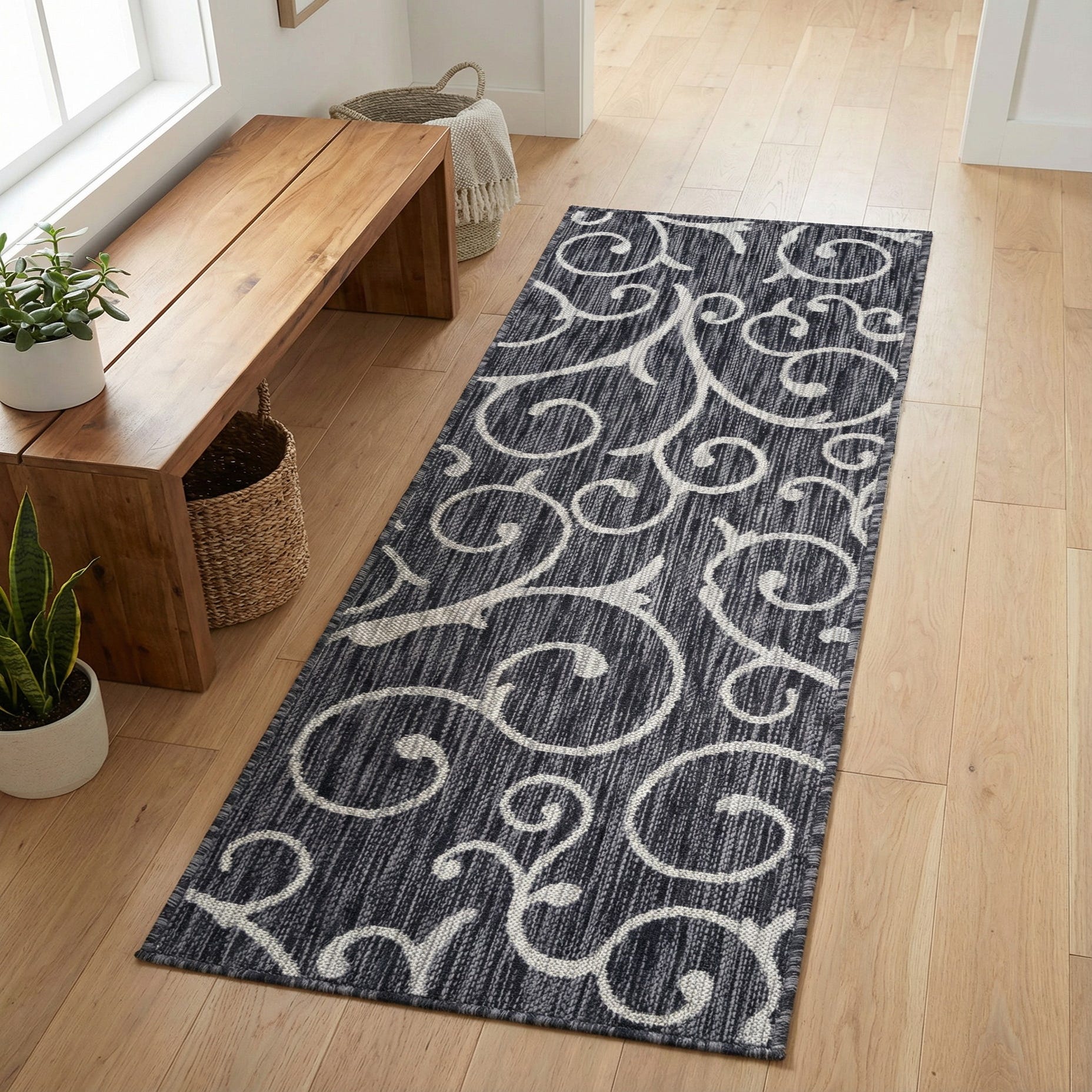 A flowing botanical scroll pattern in soft gray unfurls across a charcoal gray background, creating a refined contrast that reads both modern and classic. Machine-made from 100% polypropylene, the rug has a low-profile, ribbed texture with tightly woven fibers that feel firm yet slightly forgiving underfoot. The raised scroll motifs add a subtle dimensionality against the linear ground, giving the surface a tactile, layered look without excess pile.