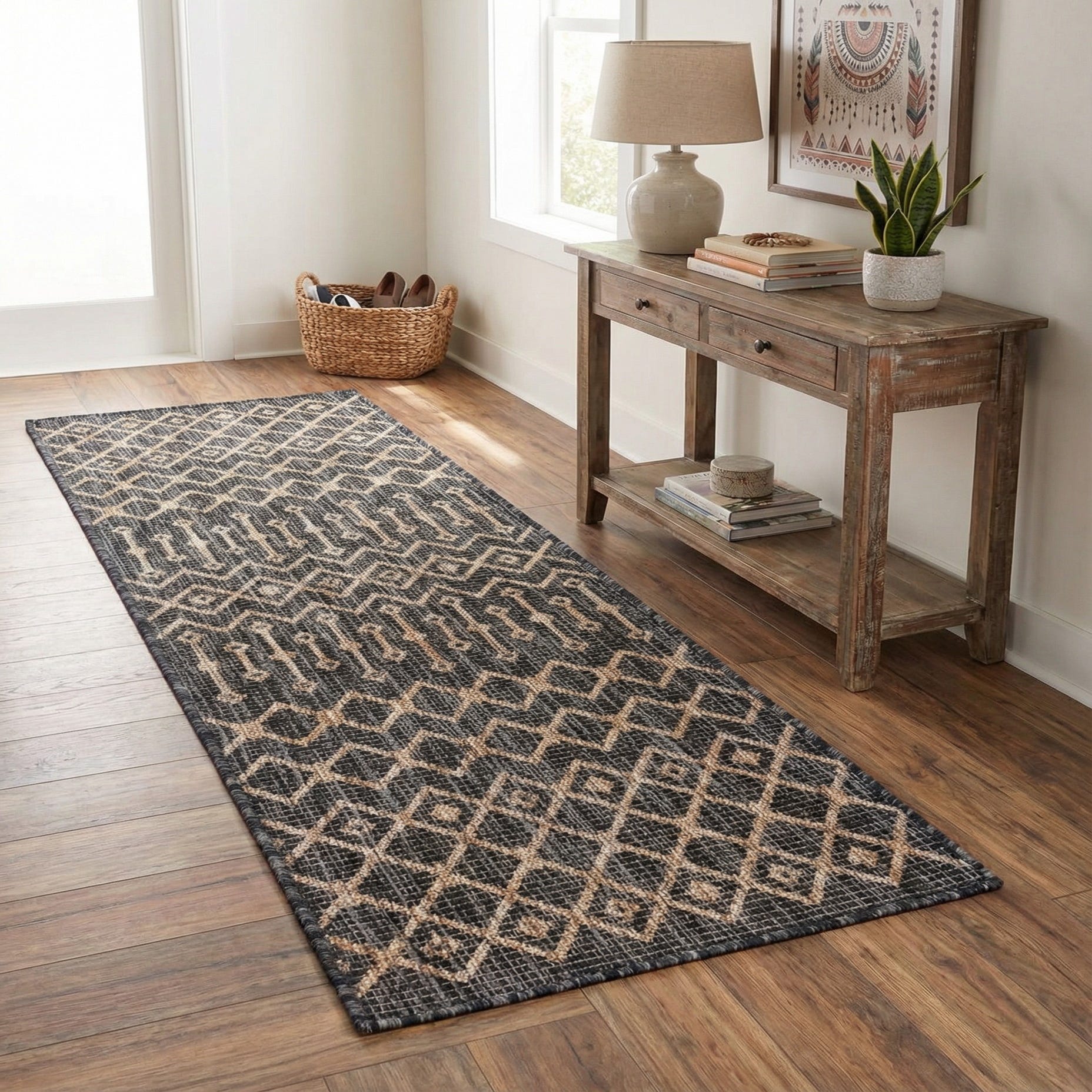 A bold charcoal gray field anchors a repeating lattice of natural-colored diamonds and small geometric accents that run the length of the runner. Bands of elongated, key-like motifs alternate with tighter diamond patterns to create a rhythmic, layered look. The surface is machine-made from 100% polypropylene and has a low, slightly textured, flatweave feel—firm underfoot with a subtle grid-like texture that highlights the contrast between the charcoal background and the natural pattern.