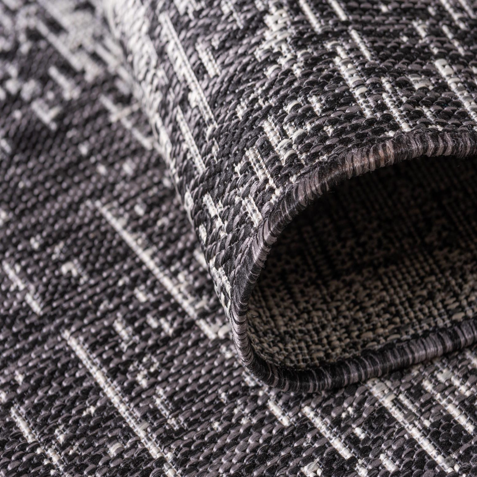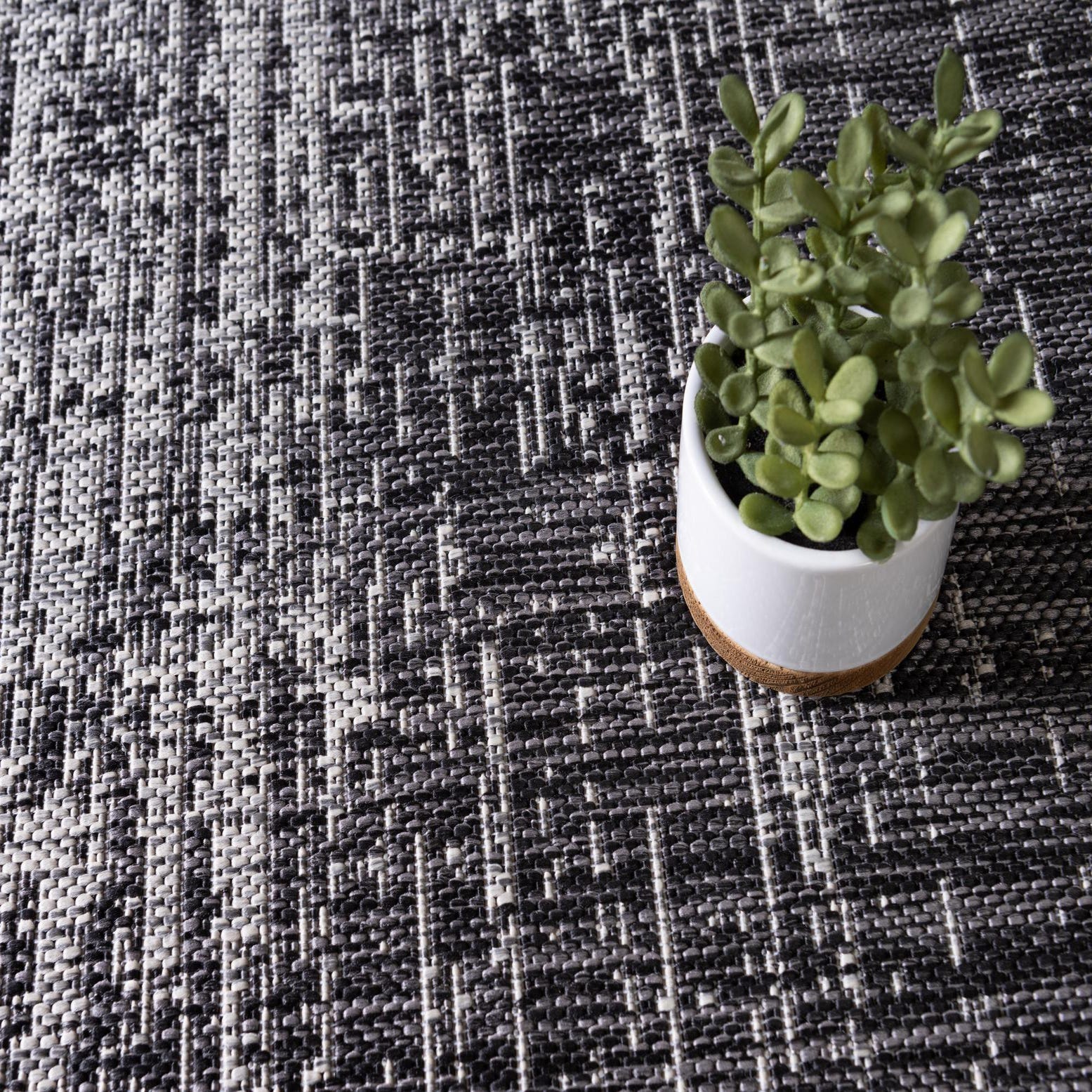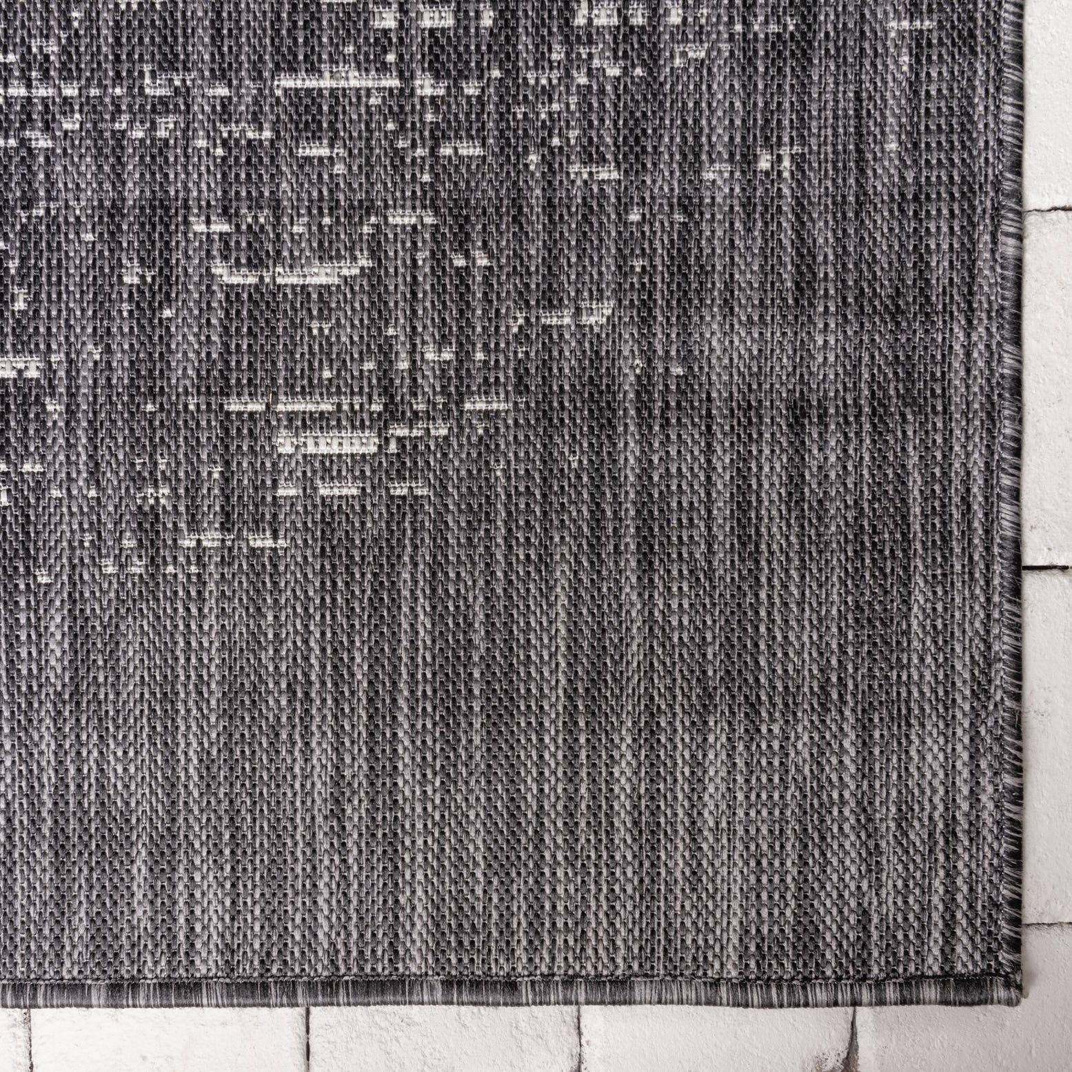 Machine-made of 100% polypropylene, the surface has a low-profile, tightly woven feel with subtle ribbing you can sense underfoot. Use this runner to define a hallway or entry, ground a narrow kitchen passage, or add texture to a covered outdoor seating area. Its charcoal and gray palette pairs well with cool woods and metal accents, minimalist furnishings, or a monochrome scheme where a bold, modern accent is needed.