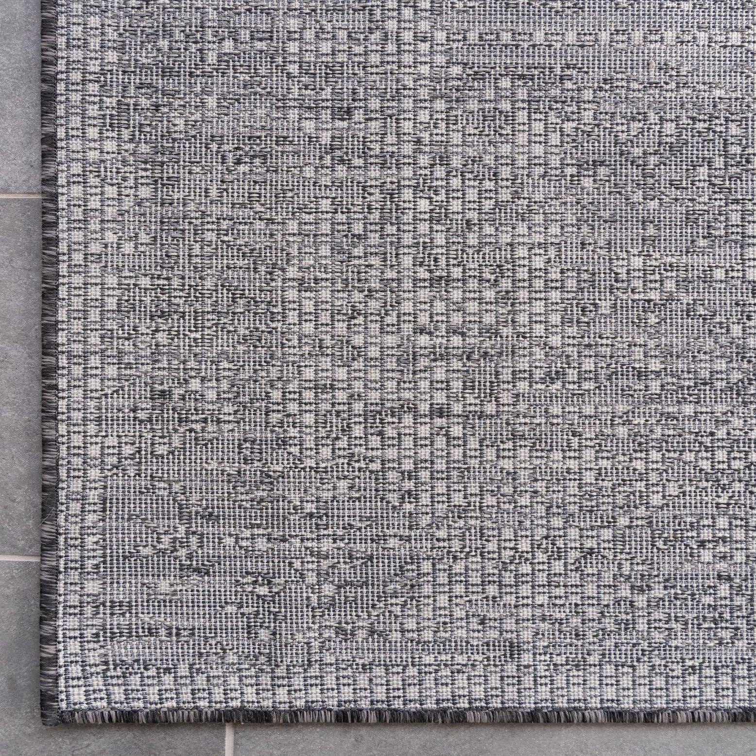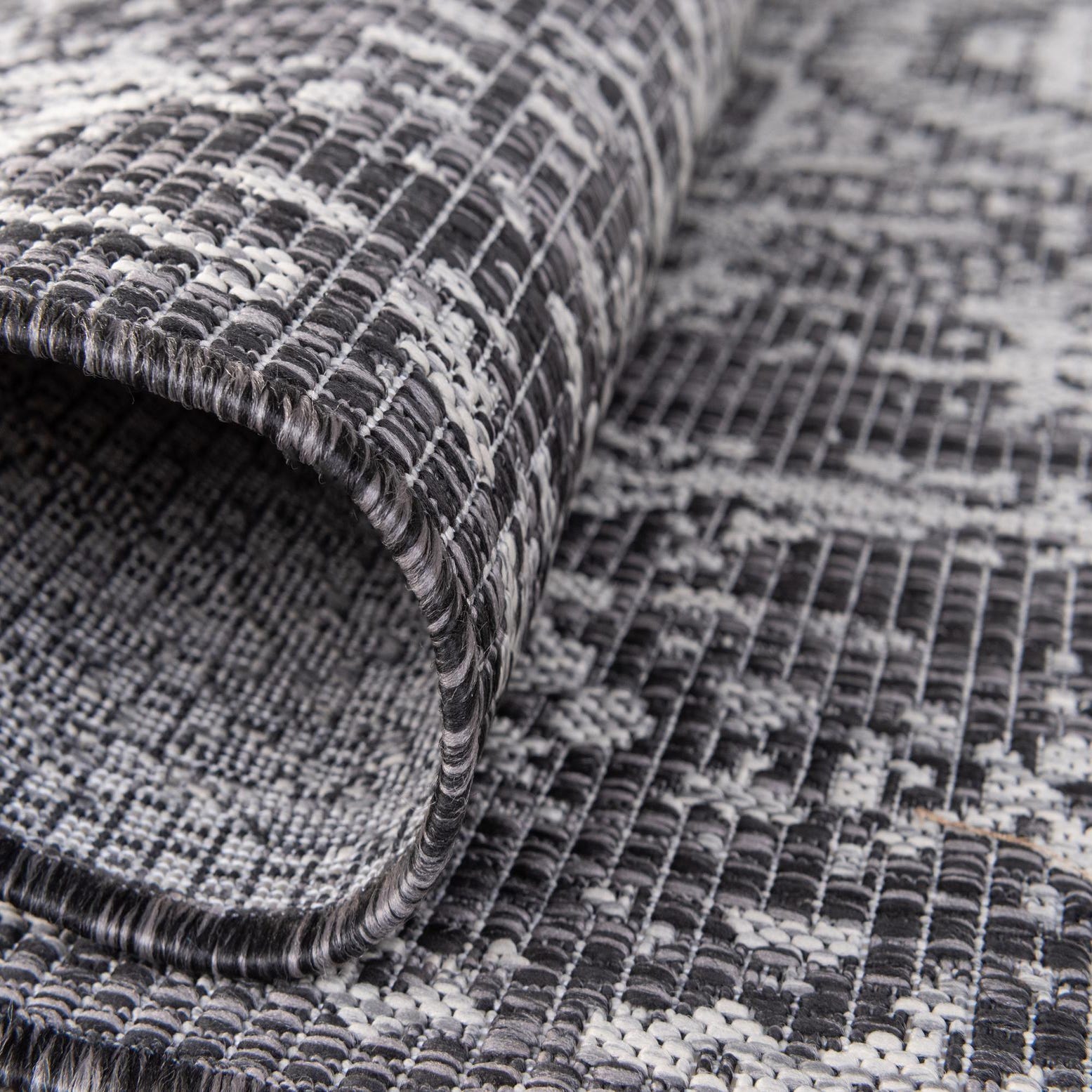 A traditional medallion layout is rendered in a worn, distressed finish across a Charcoal Gray background, with softer gray motifs and a subtle border that read like a timeworn heirloom. The machine-made construction in 100% polypropylene creates a low-profile, tightly woven surface you can feel — a textured flatweave with slight grain and a fine, grid-like pattern where the darker yarns contrast the lighter grays. The overall effect is a softly aged look that retains clear pattern definition without heavy pile.