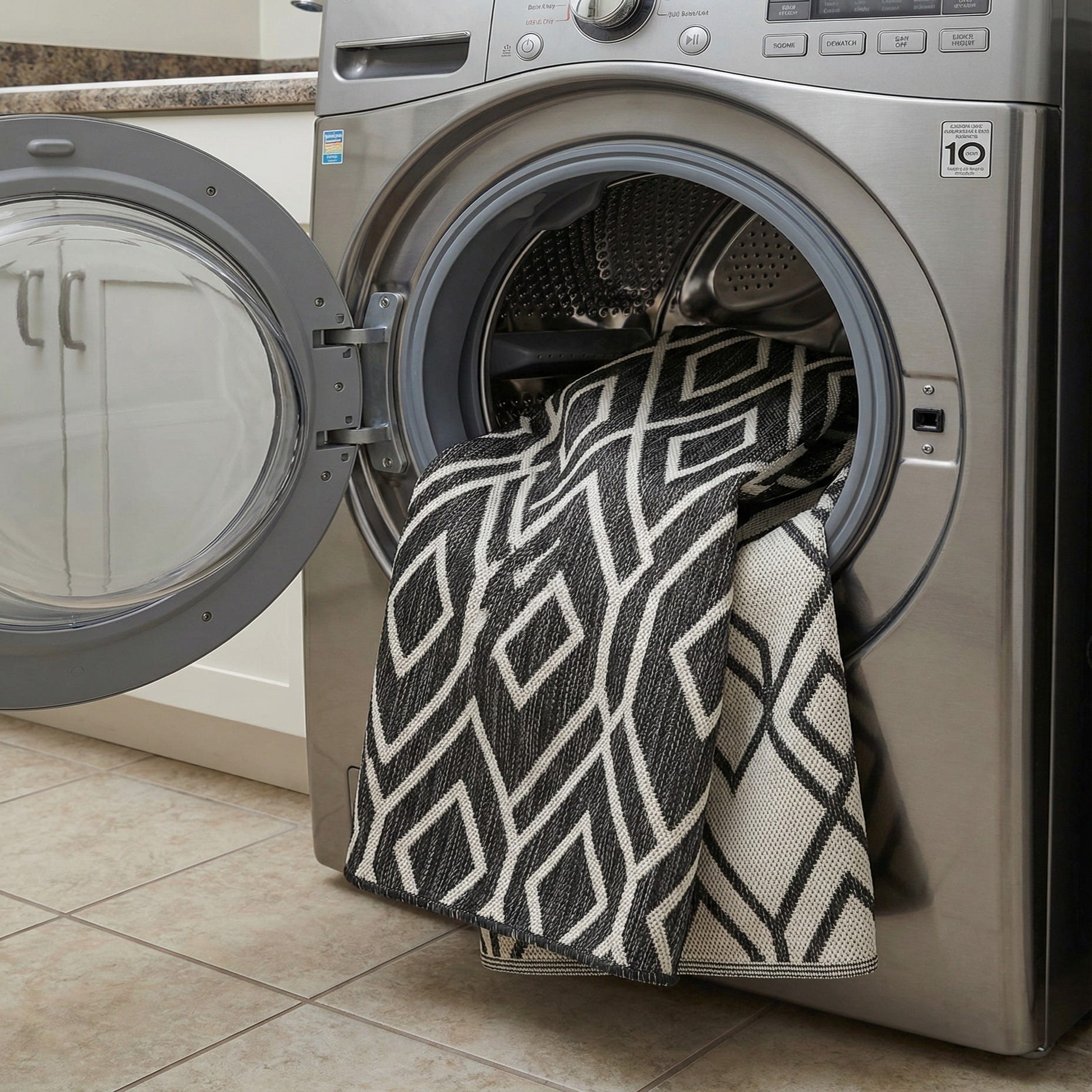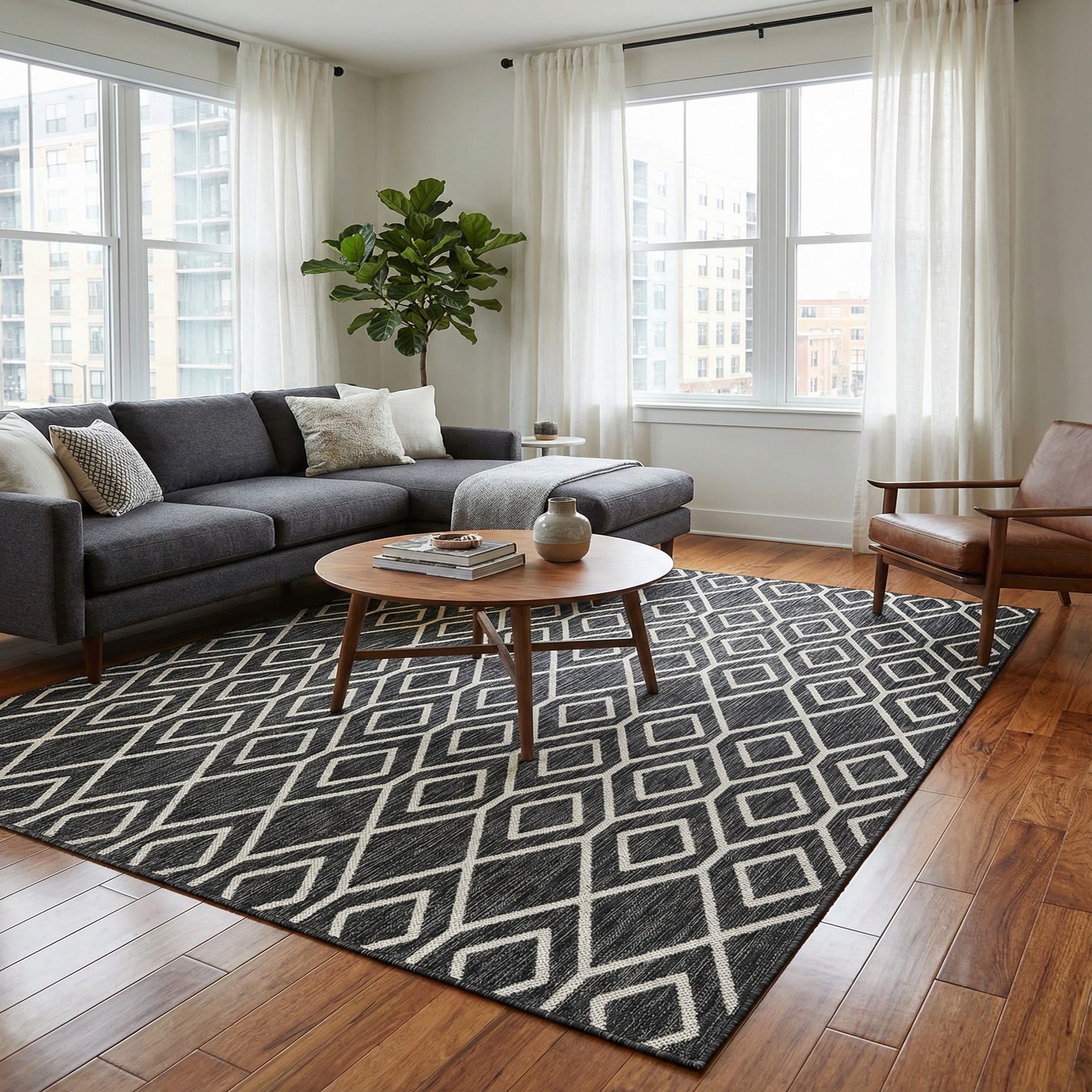 Designed for outdoor use but equally at home in casual indoor spaces, this rug defines seating or dining areas on a covered patio, balcony, or deck. Pair it with black metal or warm wood furniture for a contemporary look, layer it with neutral cushions and woven accents for a modern coastal vibe, or use it in a sunroom or mudroom to ground everyday traffic areas with straightforward, modern style.