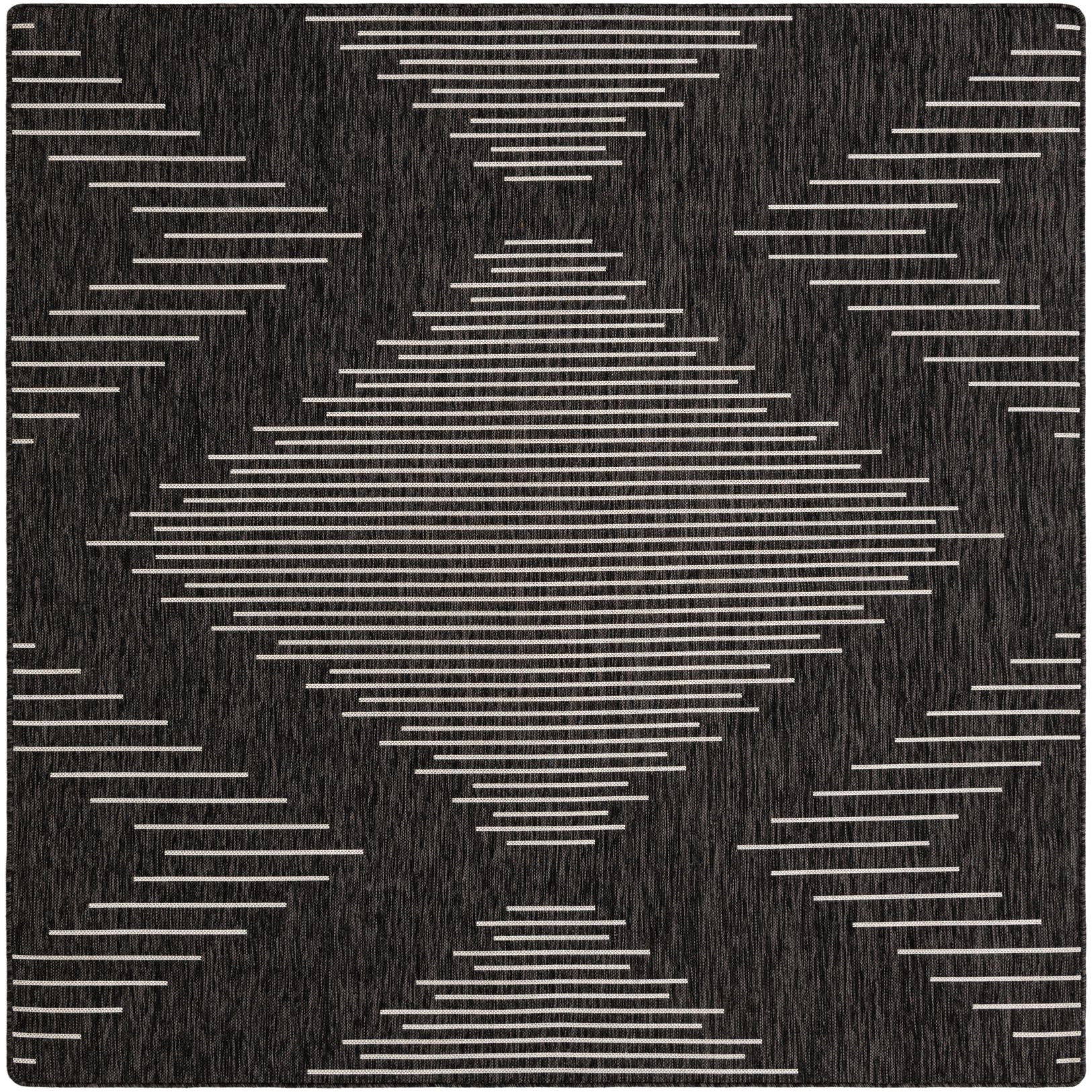 A 6x9 rectangular black and gray Southwestern-style rug with a modern striped diamond pattern, suitable for indoor or outdoor use.