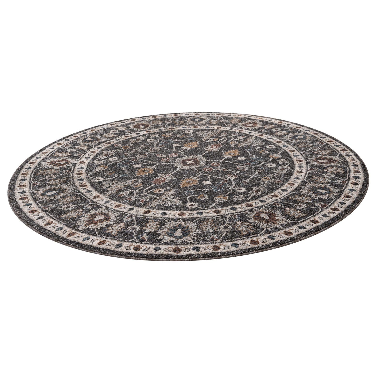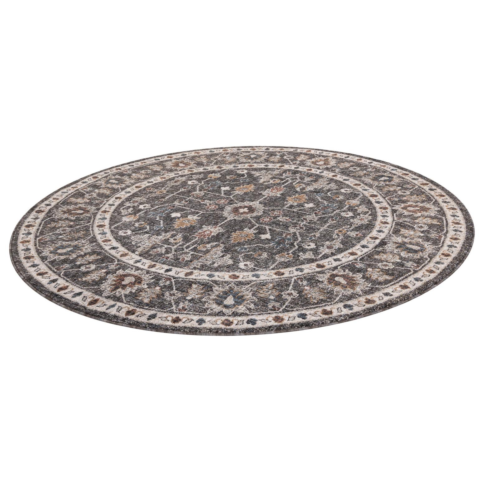 A classic round medallion with concentric borders and delicate floral vine motifs, this rug pairs traditional patterning with a muted, lived-in look. The charcoal gray background anchors the design while shades of gray, ivory, and light brown trace the central motif and border, creating subtle contrast and layered depth. Machine made of 100% Recycle Space Dyed Polyester, the surface has a low, dense pile with a soft hand and a slight tonal variation from the space-dyed yarns that gives the design a gently heathered effect.