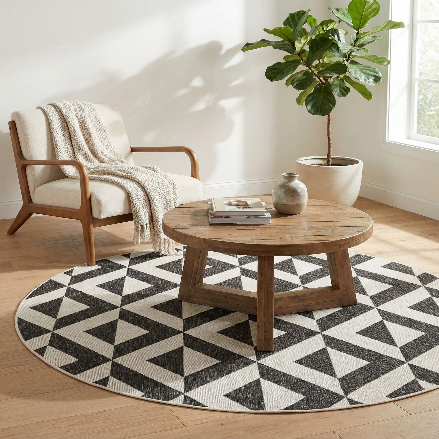 A bold geometric motif sweeps across the round field in a clean, modern arrangement of interlocking diamonds and chevrons. The pattern is rendered in crisp Ivory set against a Charcoal Gray background, creating strong contrast and a rhythmic, almost sculptural read to the surface. The round shape naturally centers seating arrangements and brings a graphic focal point to both indoor and covered outdoor rooms.