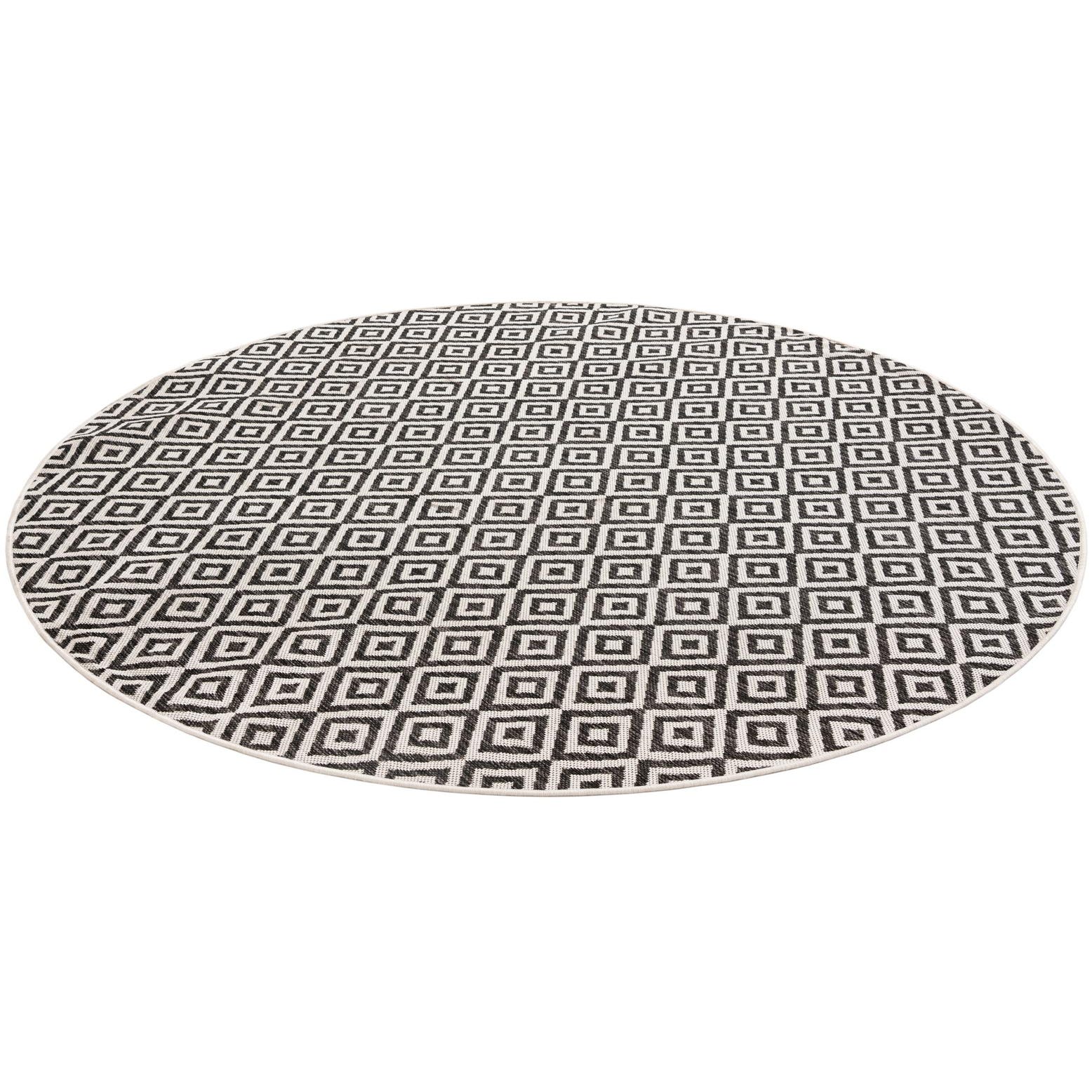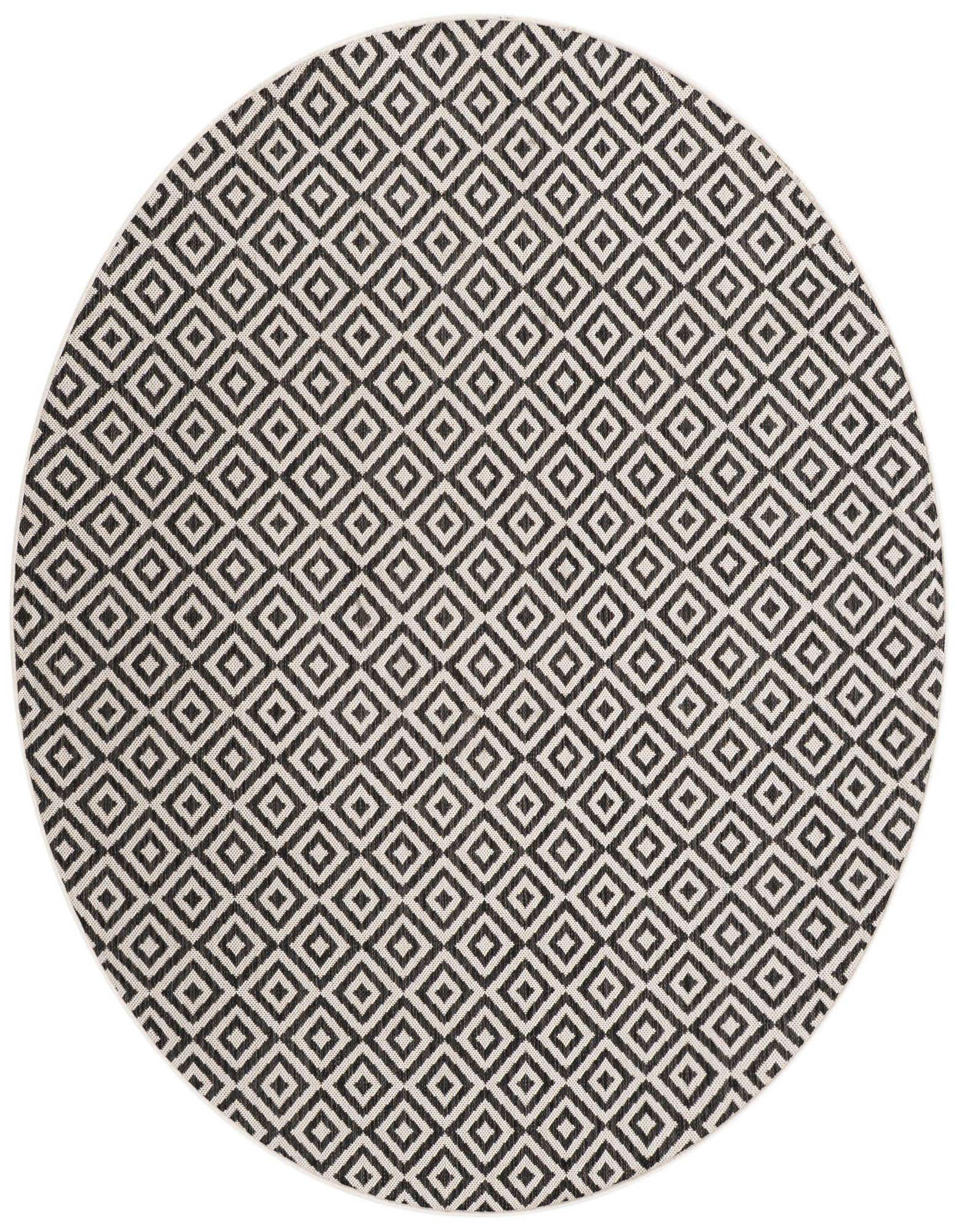 The Jill Zarin Outdoor Collection presents a 7 Ft Round rug that features a dynamic geometric pattern, accented by a modern color palette of charcoal gray and ivory. The background's charcoal gray lends a bold contrast to the crisp ivory designs, creating an engaging visual field. Machine-woven of 100% polypropylene, this rug is designed for durability and ease of maintenance.
