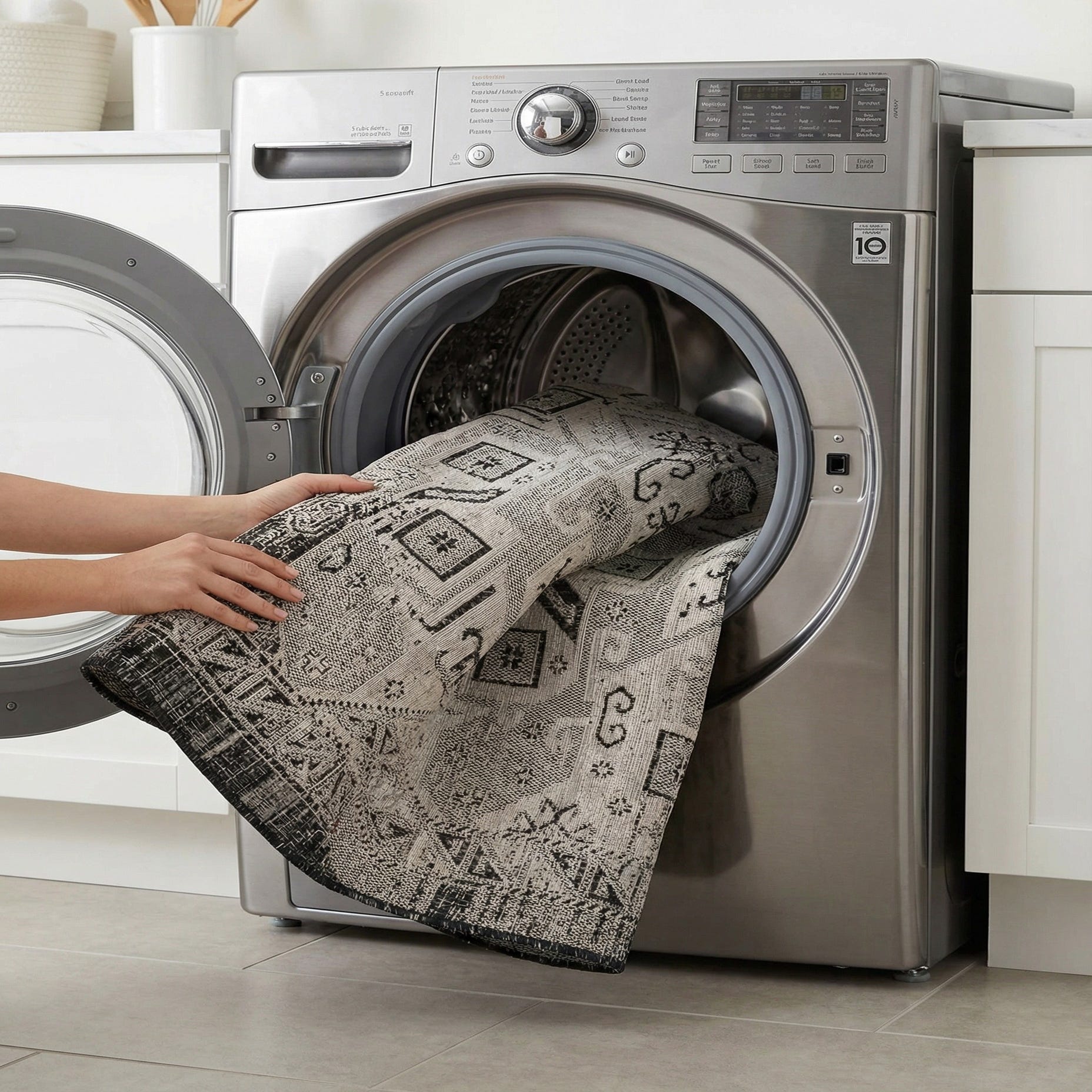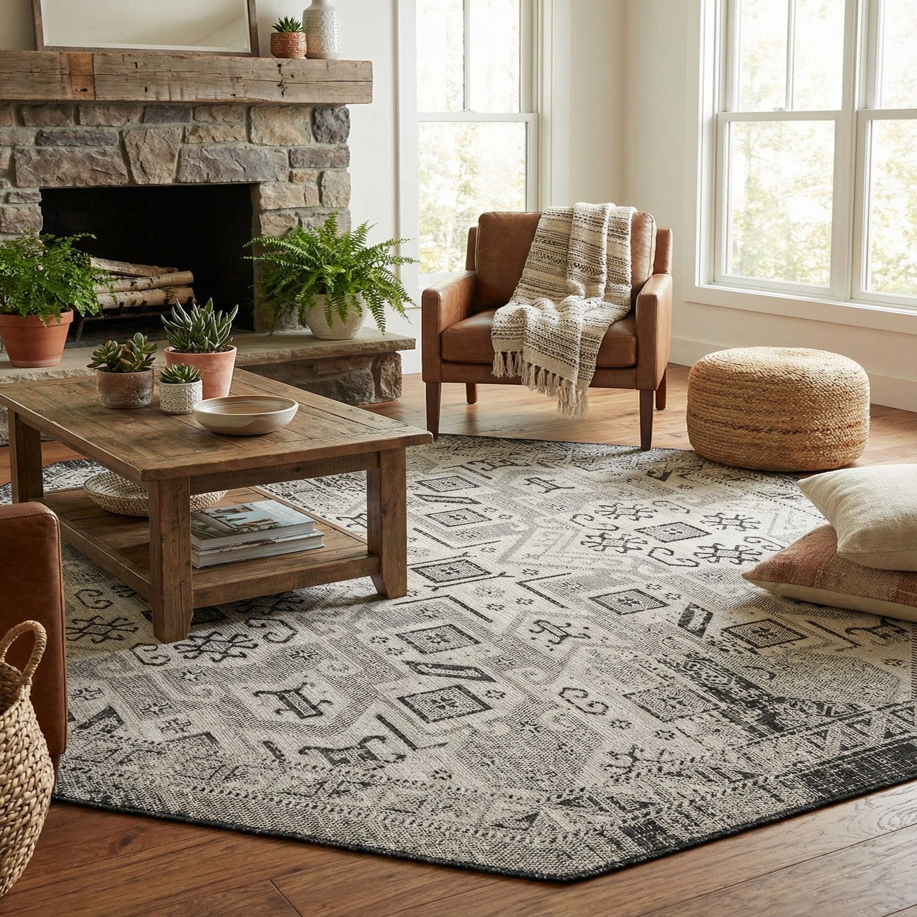 This rug suits a range of indoor and covered-outdoor settings. Place it under a round dining table or in a cozy conversation nook to echo the octagonal form, or position it on a covered patio to anchor wicker or metal seating. Its charcoal-and-ivory palette pairs well with natural wood tones, black metal accents, leather upholstery, and neutral linens, and it complements transitional, modern farmhouse, industrial, and contemporary bohemian schemes.