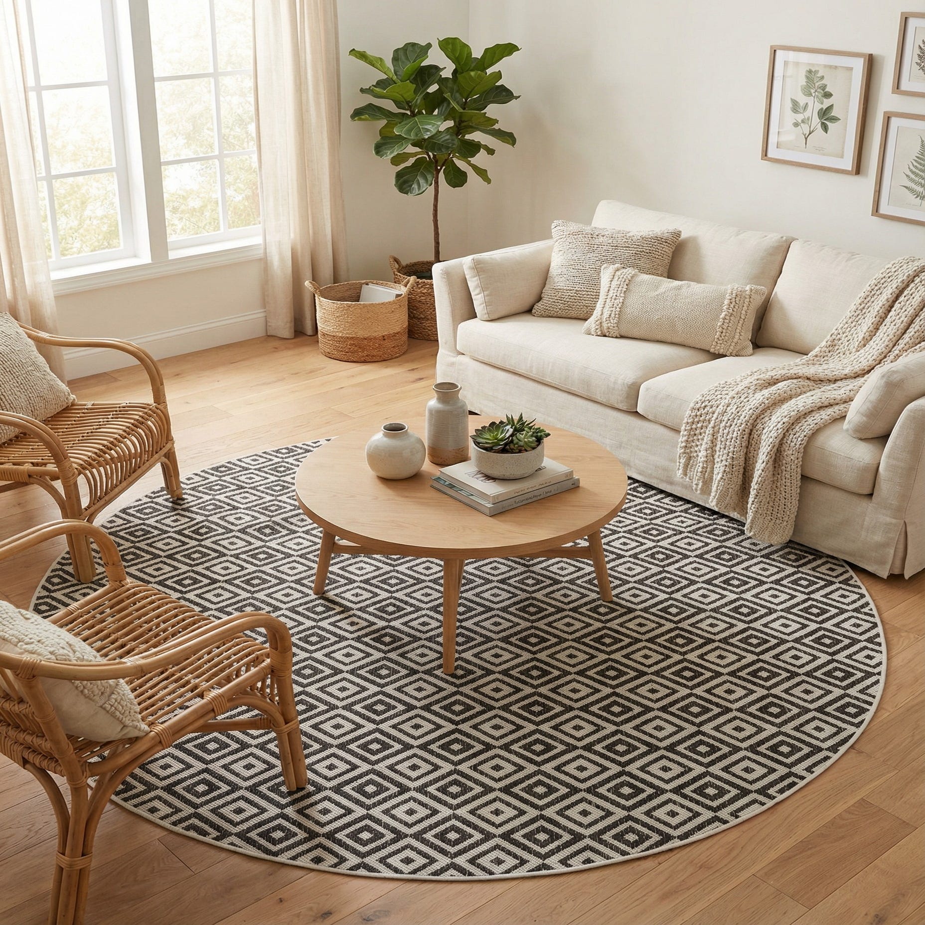 Machine-made from 100% polypropylene, this piece performs well in high-traffic areas and outdoor living spaces where style and durability are both needed. It anchors a round dining table on a covered patio, defines a cozy seating area on a modern balcony, or complements a monochrome living room with metal and wood furnishings. Pair it with natural-finish furniture and light textiles for contrast, or use it to reinforce a contemporary black-and-white palette.