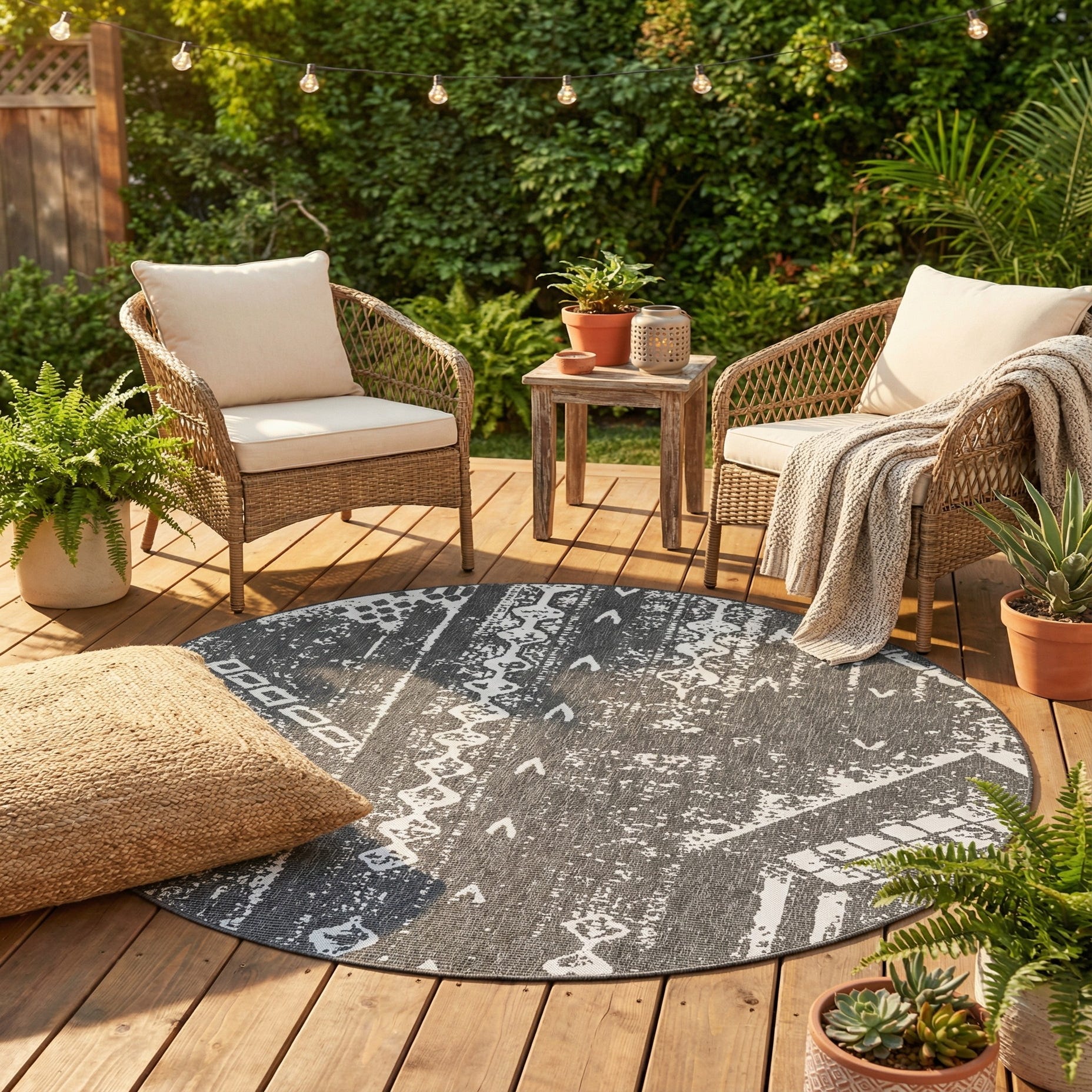 A 7' 10 round black and white modern bohemian rug with a distressed geometric pattern, suitable for a patio.