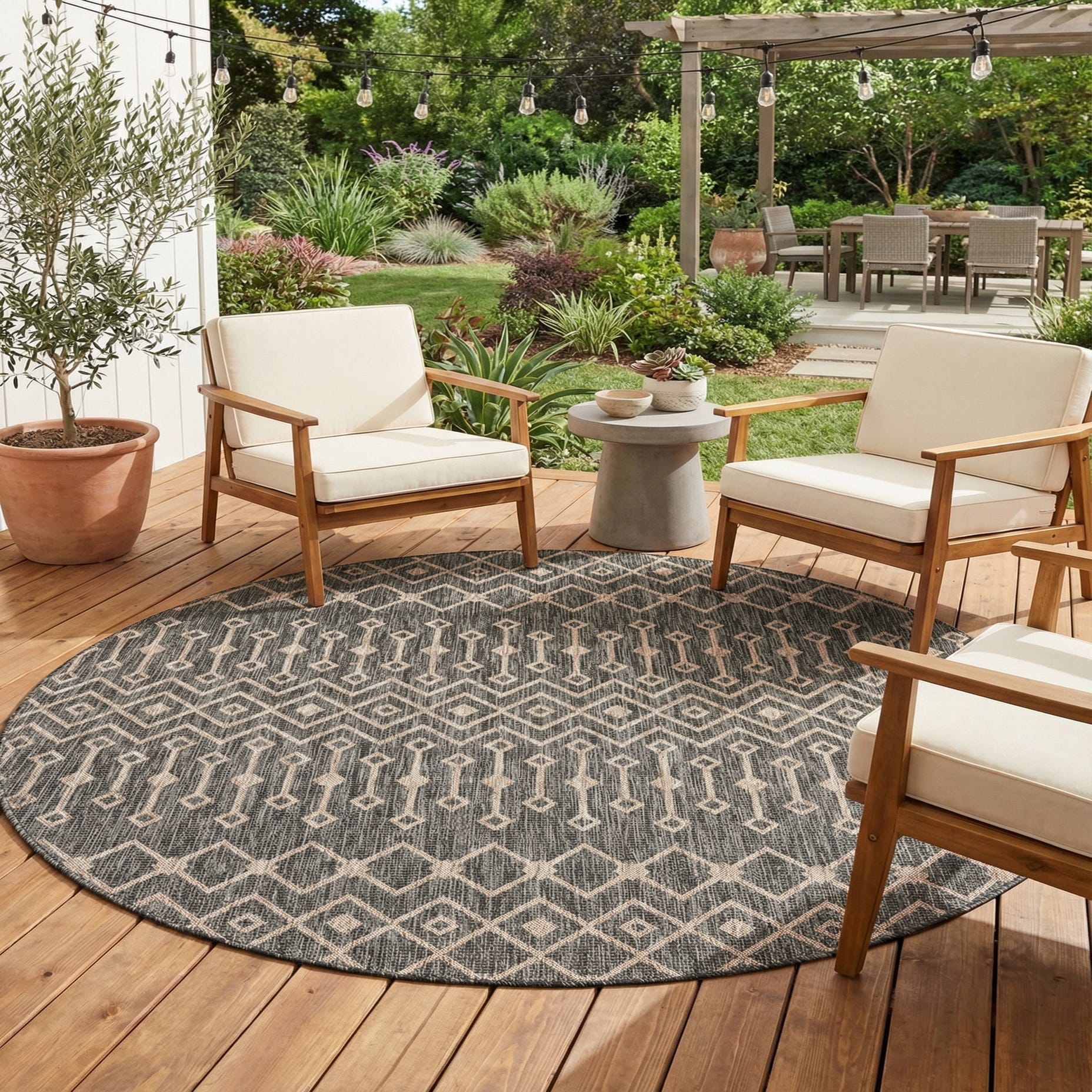 Machine made from 100% polypropylene, this round outdoor rug offers a sturdy, low-profile construction that works well on covered patios, porches, or high-traffic indoor areas like a casual dining nook or entry. It pairs naturally with warm wood and rattan furnishings, matte black metal frames, and neutral linens—ideal beneath a round bistro set on a balcony or anchoring a cozy seating arrangement on a covered patio.