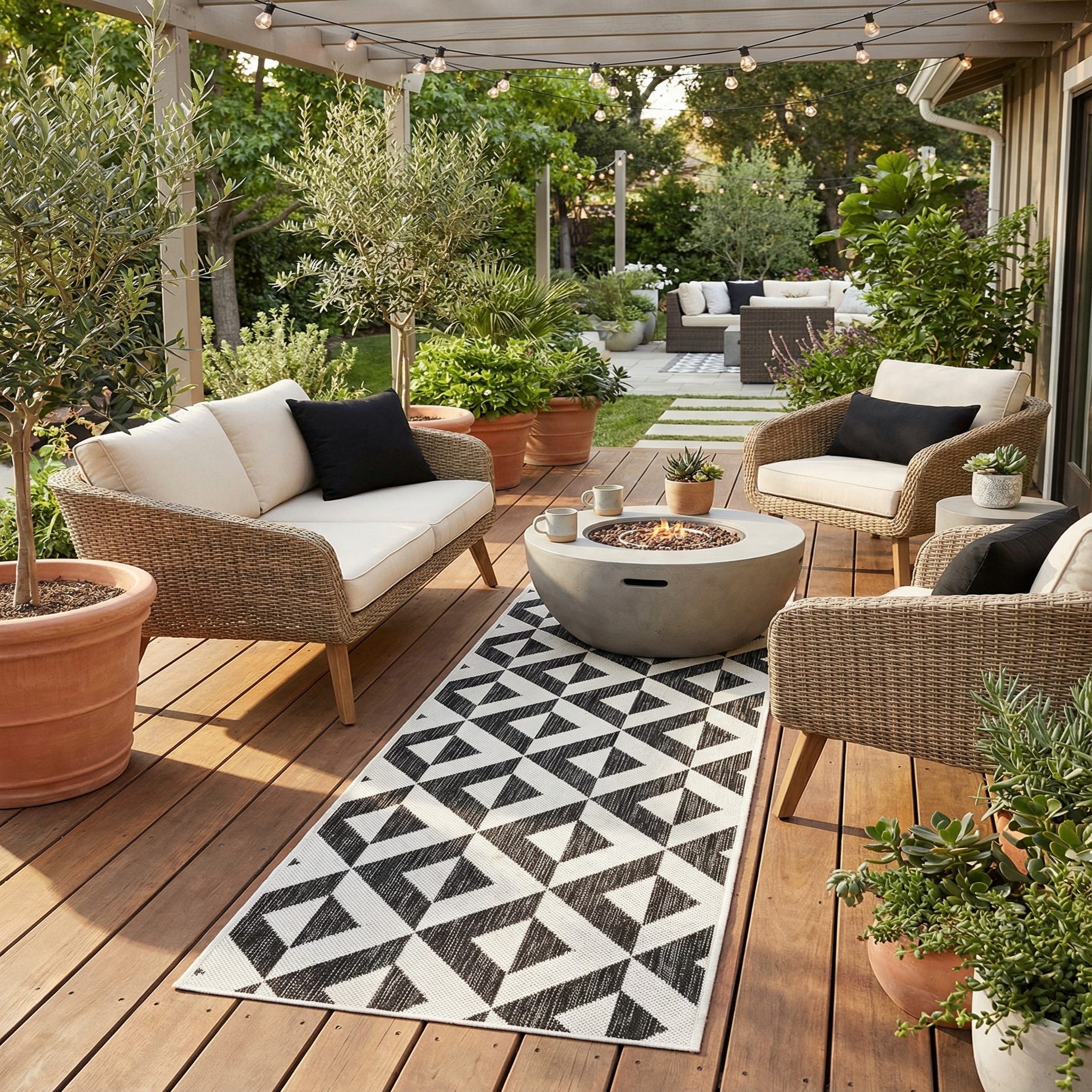 This runner is well-suited to narrow traffic areas like hallways and entryways, and it can anchor a kitchen galley, covered porch, or balcony with a strong visual rhythm. Pair it with light wood or painted furniture for a contemporary Scandinavian or mid-century modern vibe, or use it to add contrast in industrial and monochrome interiors. It also works nicely layered under a slim console table or alongside a bed to introduce pattern and structure without overwhelming a space.